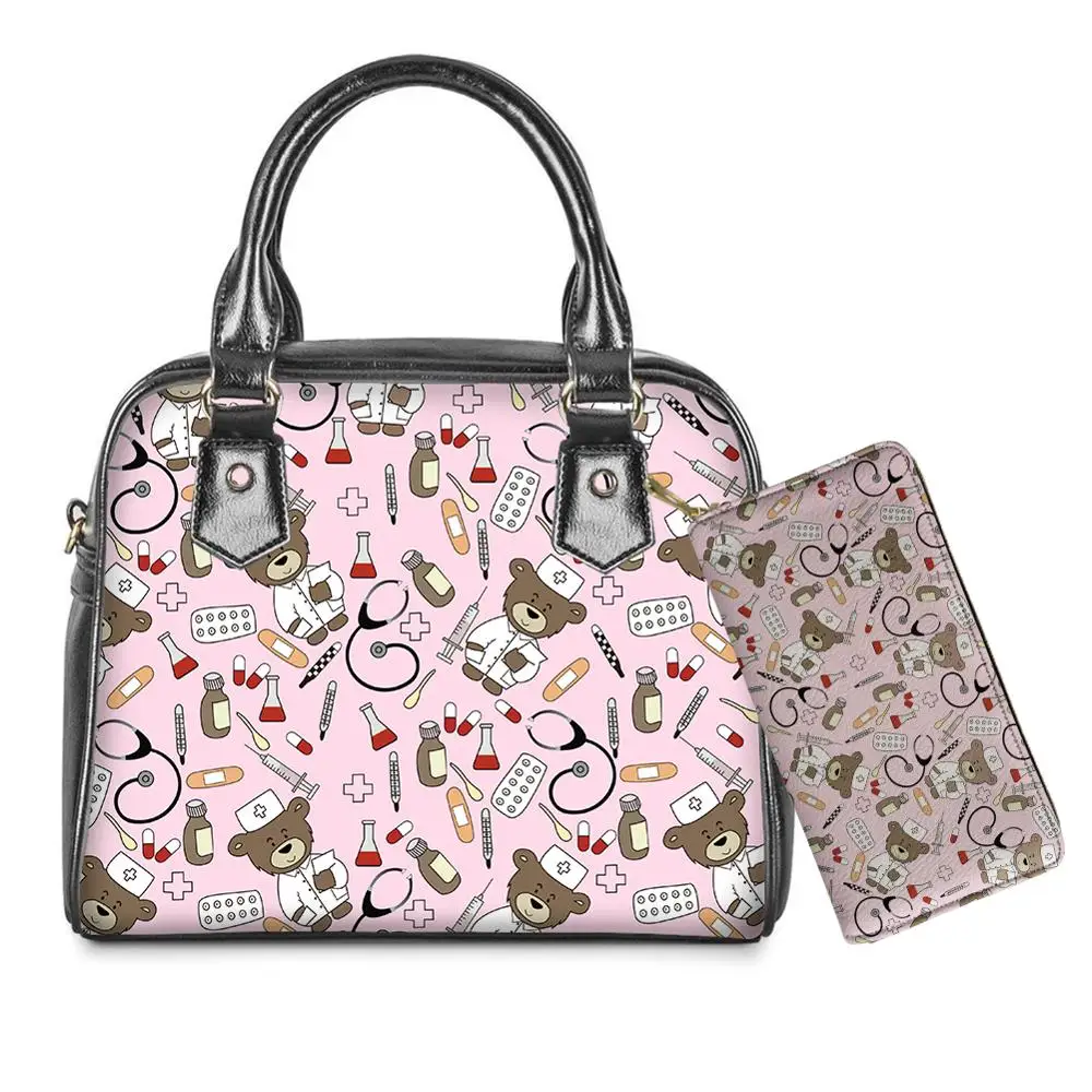 Customzied мультфильм медсестры медведь печати женщина дизайнер роскошные сумки набор женщина через плечо сумки для кормящих 2шт сумка на плечо и кошелек