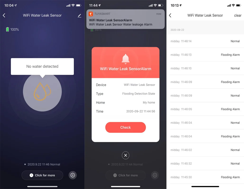 Как только датчик утечки воды thr коснется воды, датчик утечки воды отправляет уведомление в приложение.