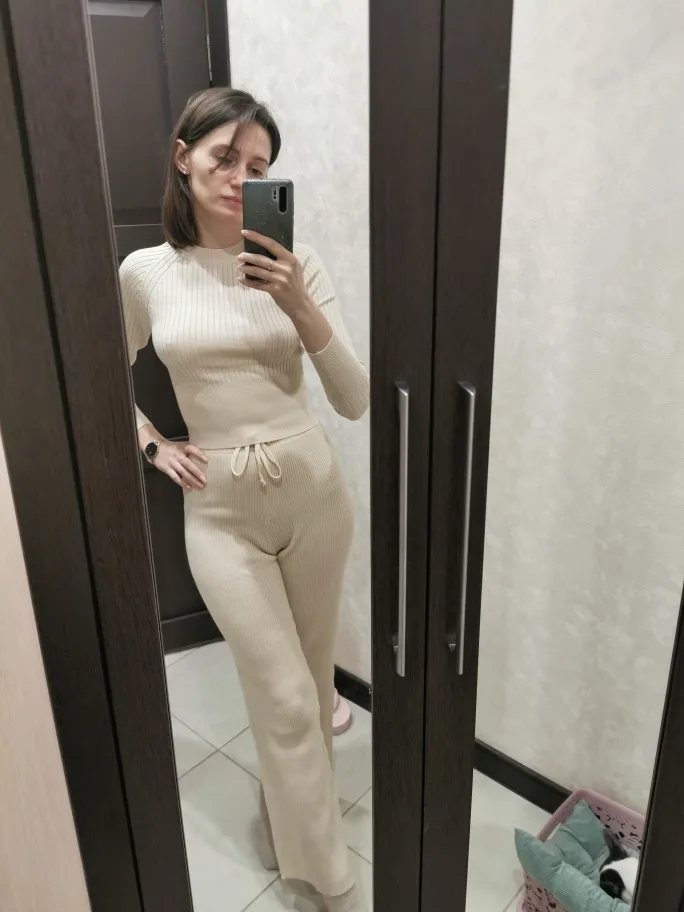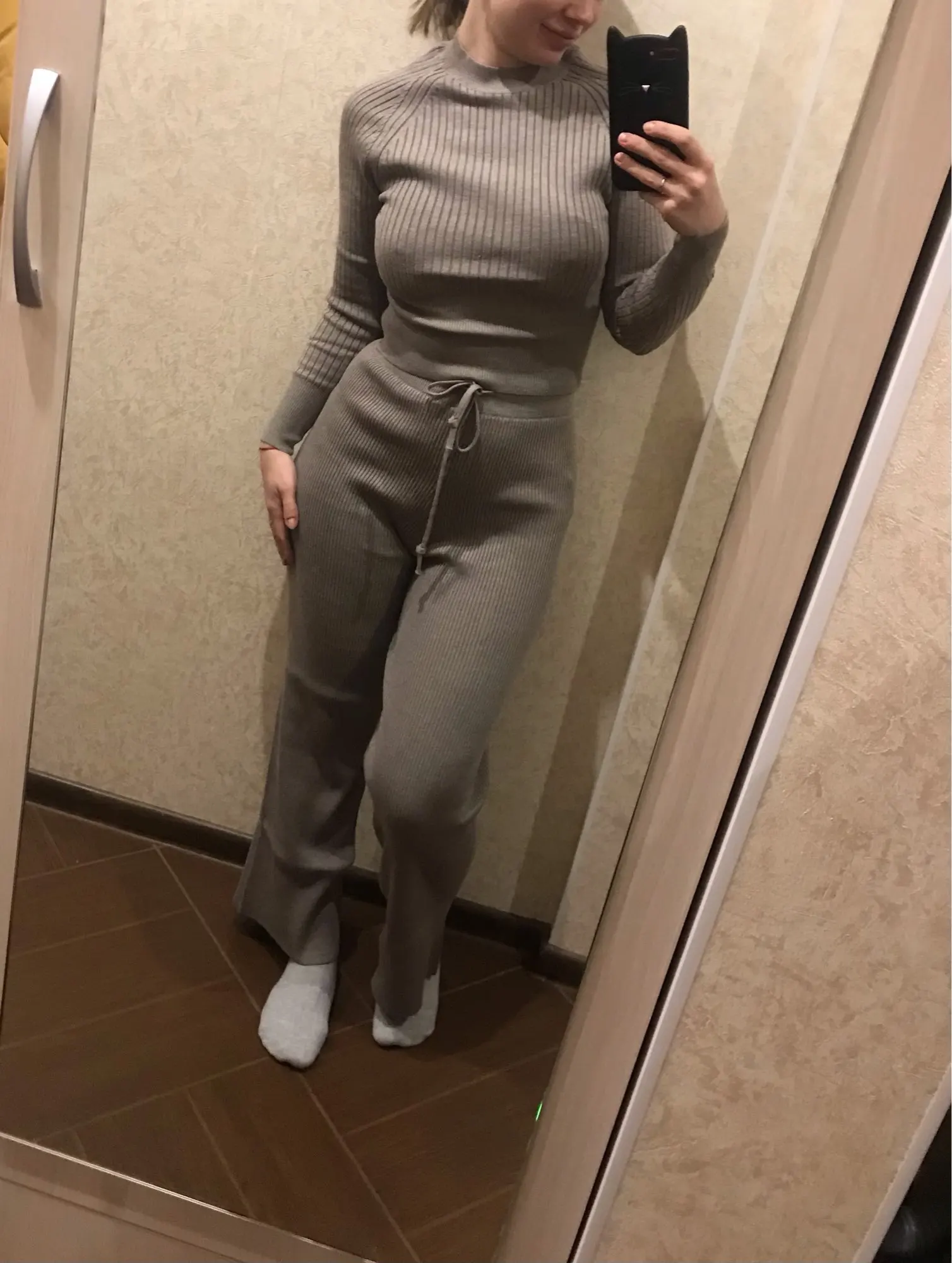 Классный костюм! Очень мягкий, тёплый. Цвет серо-бежевый. Заказала L на свою большую попу, хотя обычно ношу S, хотелось чтобы брюки сильно не облегали. Но переживала что свитер будет велик. В итоге, все отлично, свитер короткий, как я и хотела. М был бы впритык. После стирки, наверняка ещё лучше свяжет по фигуре. Рекомендую! (с продавцом не общалась)