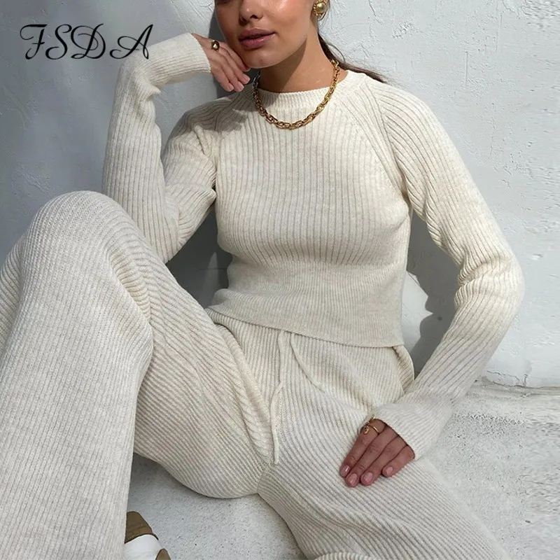 Женский трикотажный костюм FSDA, белый повседневный комплект из двух предметов, свитер с длинным рукавом и штаны в байкерском стиле, Осень-зима 2020