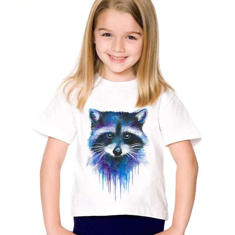 Летние белые футболки с коротким рукавом для девочек, детские футболки с акварельным принтом из енота, Детские повседневные топы для мальчиков, одежда для маленьких девочек