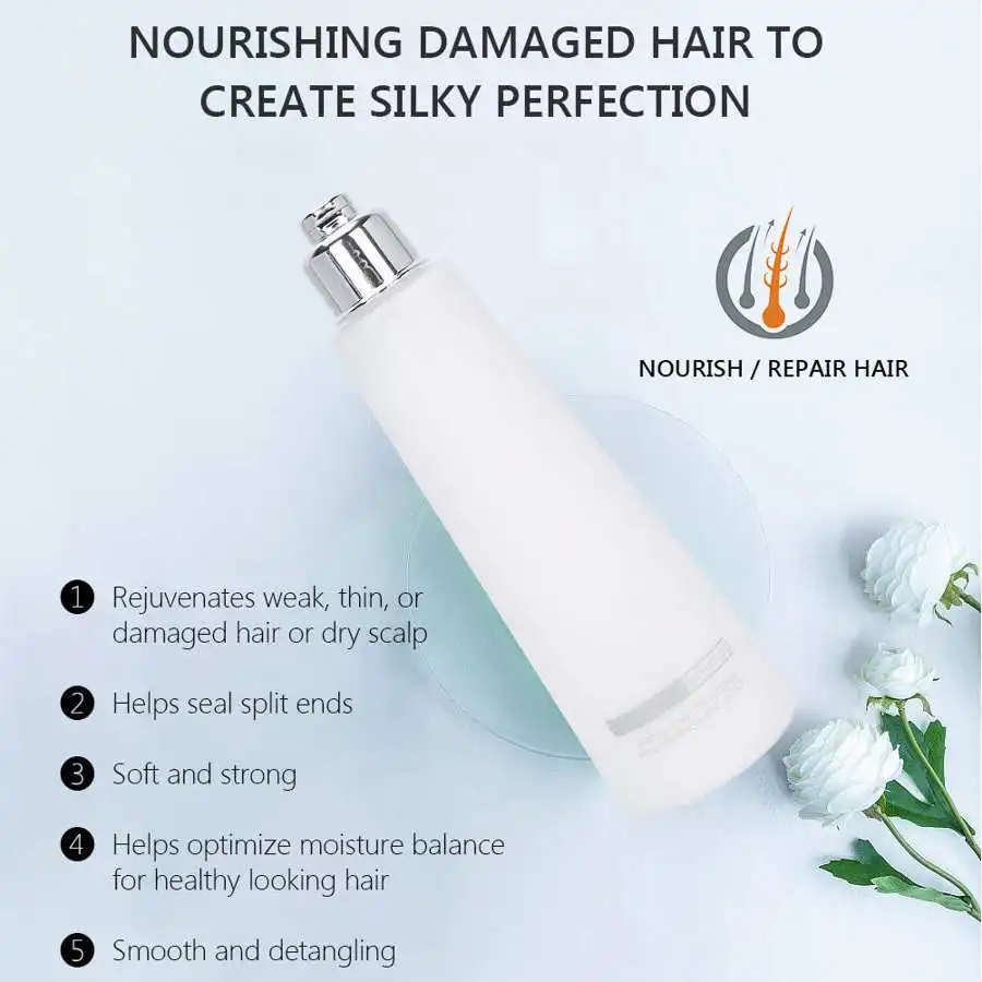 1. Он изготовлен из различных питательных и восстанавливающих компонентов для волос. 2. Он специально разработан для сухих и пушистых волос. 3. Он обеспечивает волосы различными питательными веществами, помогает восстанавливать волосы, увлажняет волосы, улучшает качество волос и делает волосы влажными, блестящими и шелковистыми 4. Питательные поврежденные волосы для создания шелковистого совершенства. Омолаживает слабые, тонкие или поврежденные волосы или сухую кожу головы. 5. Помогает оптимизировать баланс влаги для здоровых волос. Гладкая и облегчения расчесывания.