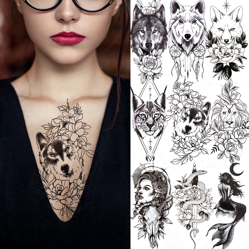 Модная временная татуировка для женщин и мужчин, собака, волк, кошка, Лев, искусственная Русалка, змея, цветок, тату-наклейка, черные геометрические татуировки