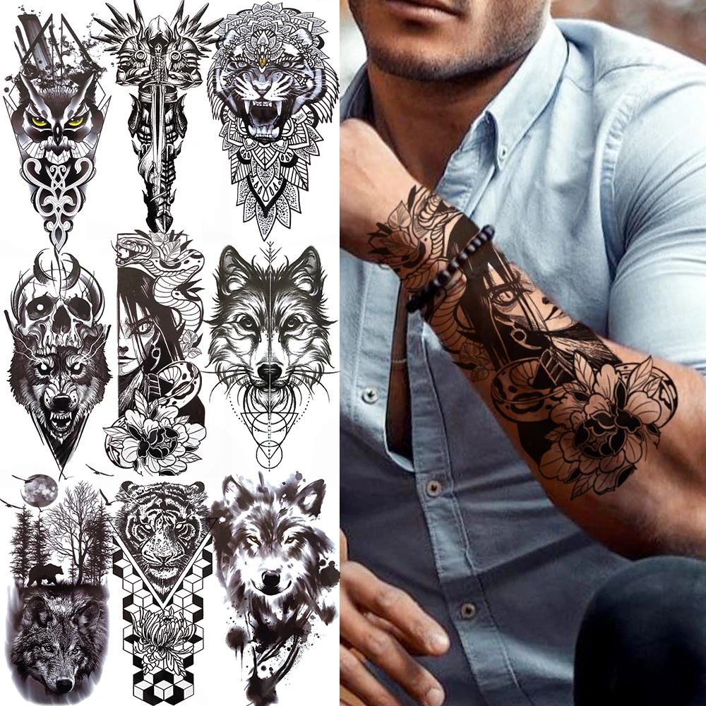 Большая змея, черная татуировка, наклейка, Сова, волк, тигр, этнический тотем, хна, искусственная татуировка для женщин, детей, искусственная лес, тату, мужская мода