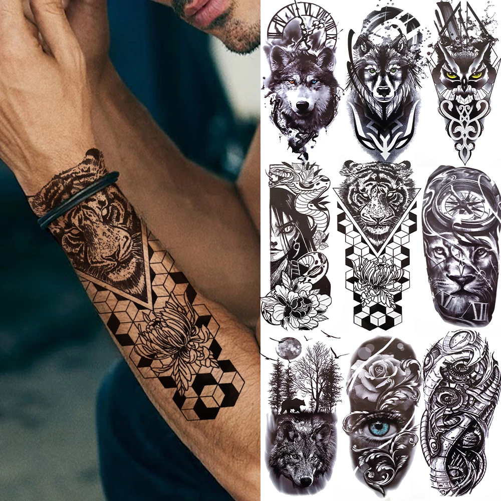Реалистичные Временные татуировки, тигр, Сова, татуировки с волком, для детей, женщин, мужчин, черный лес, цветок, тату боди-арт, тотем