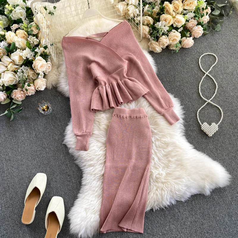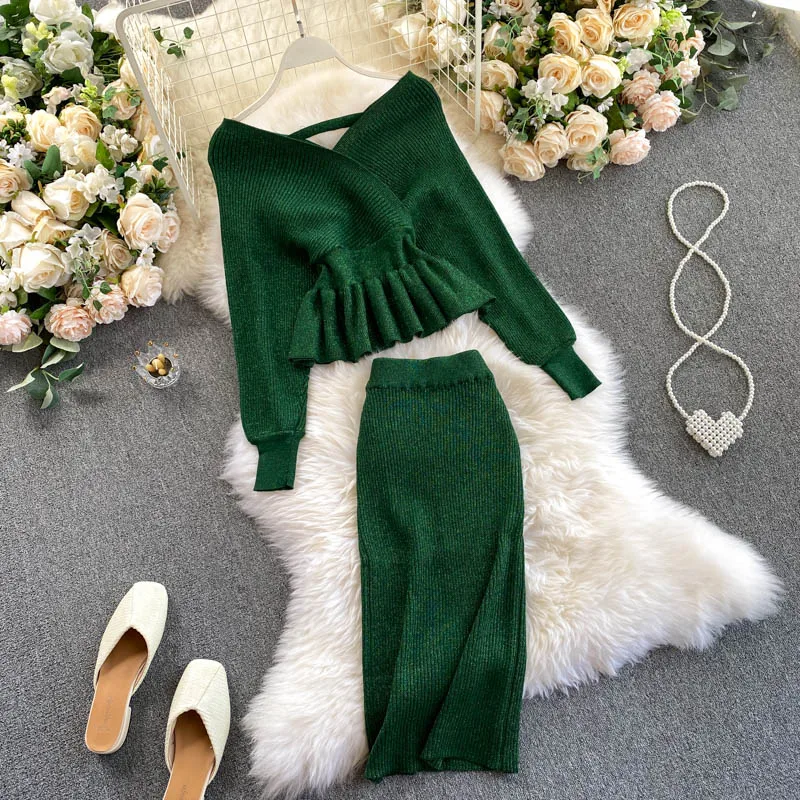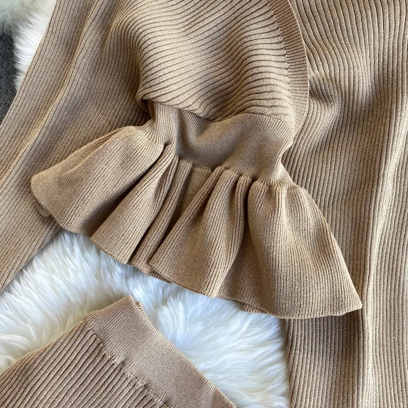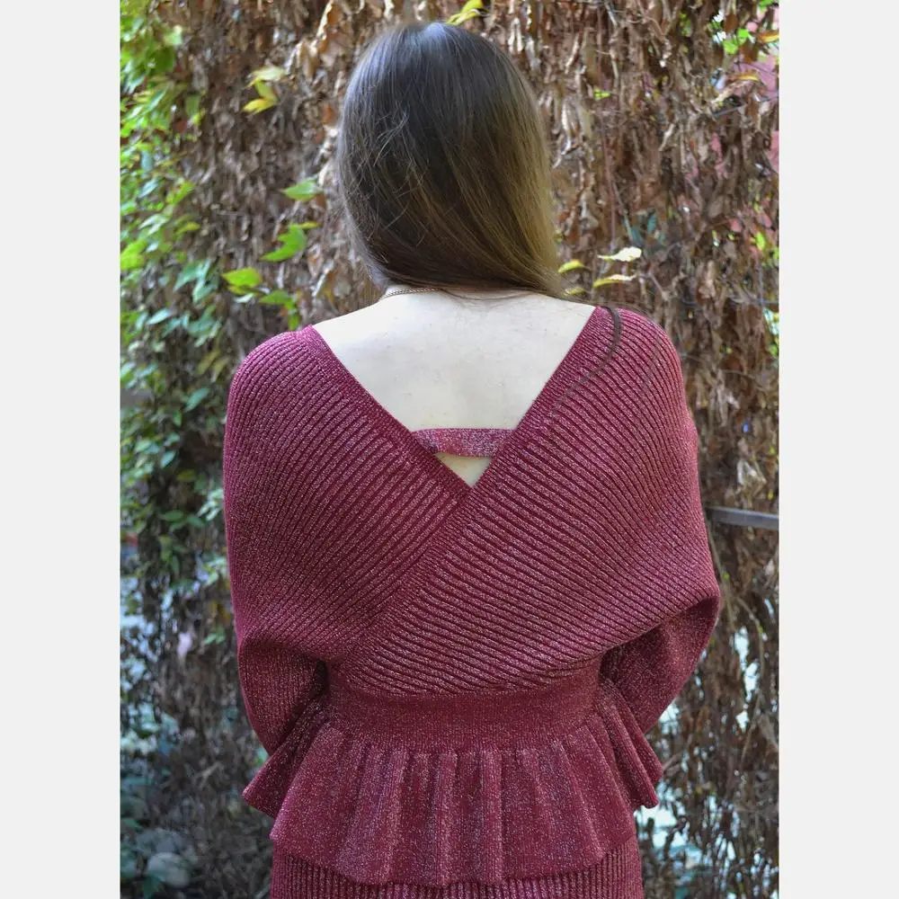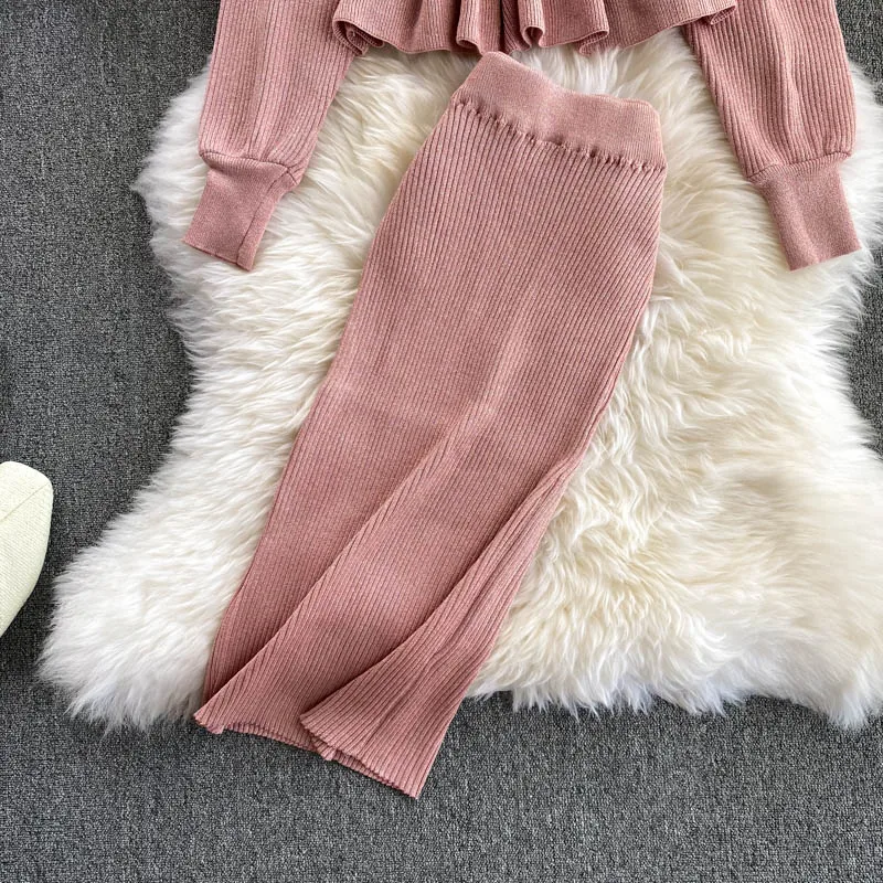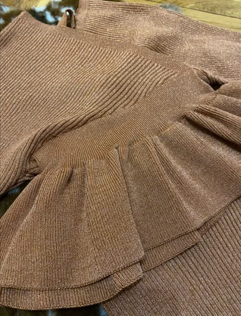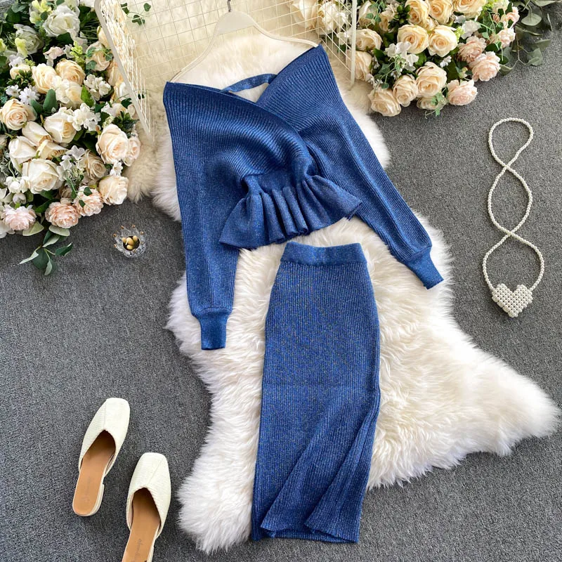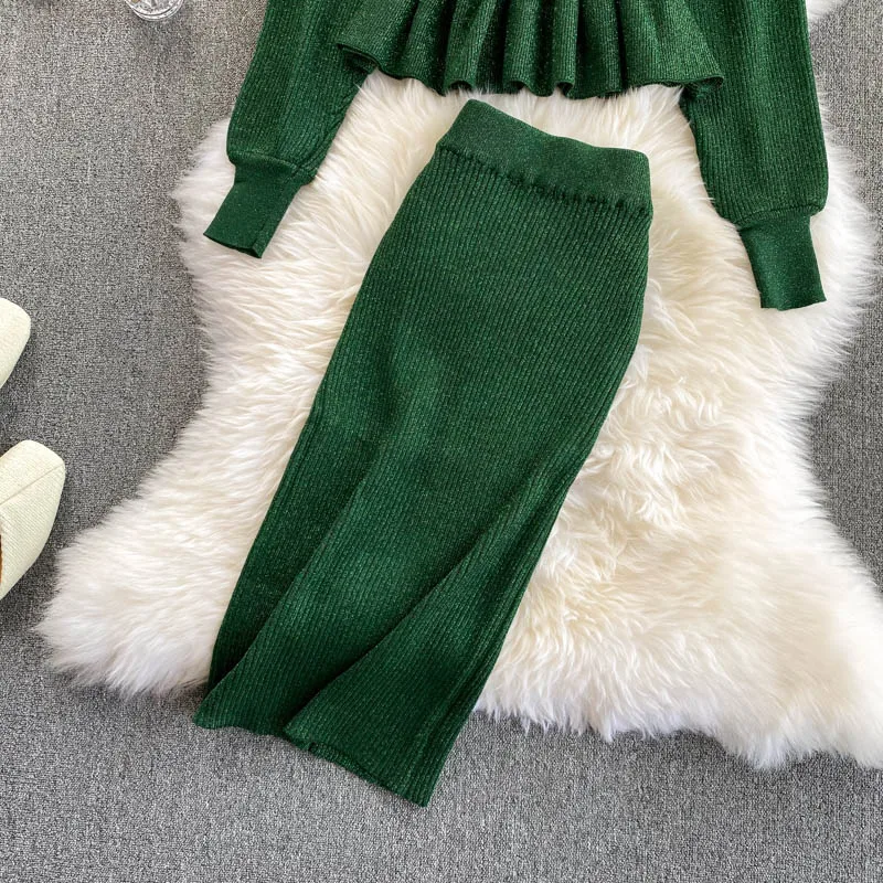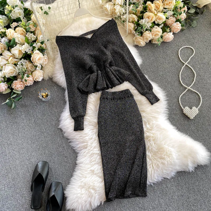 Комплект женский вязаный из юбки и свитера с люрексом, осень с оборками с длинными рукавами