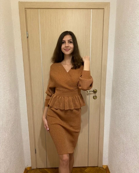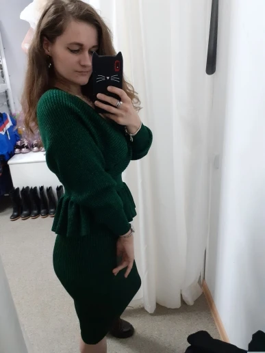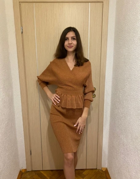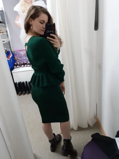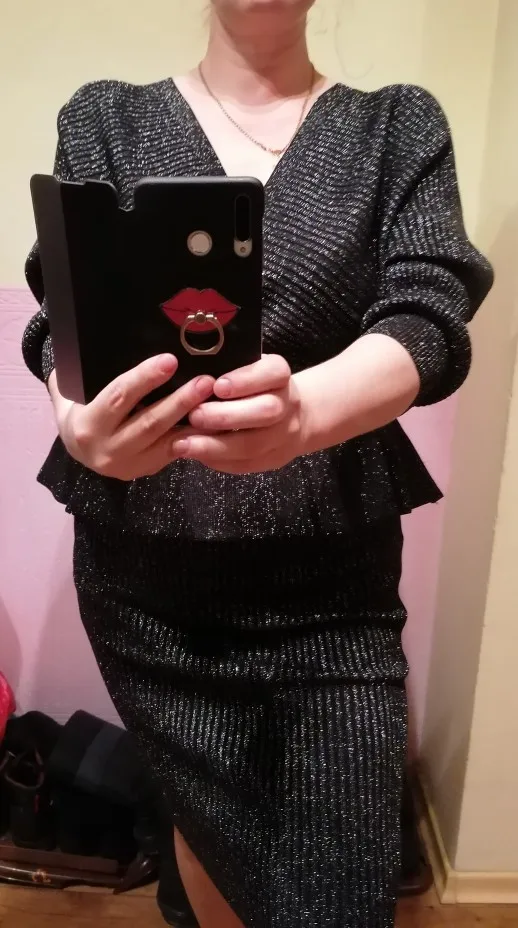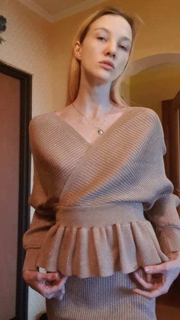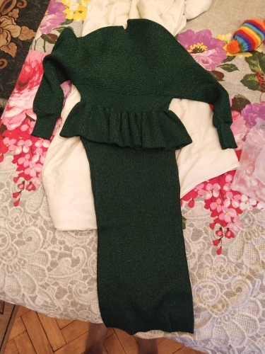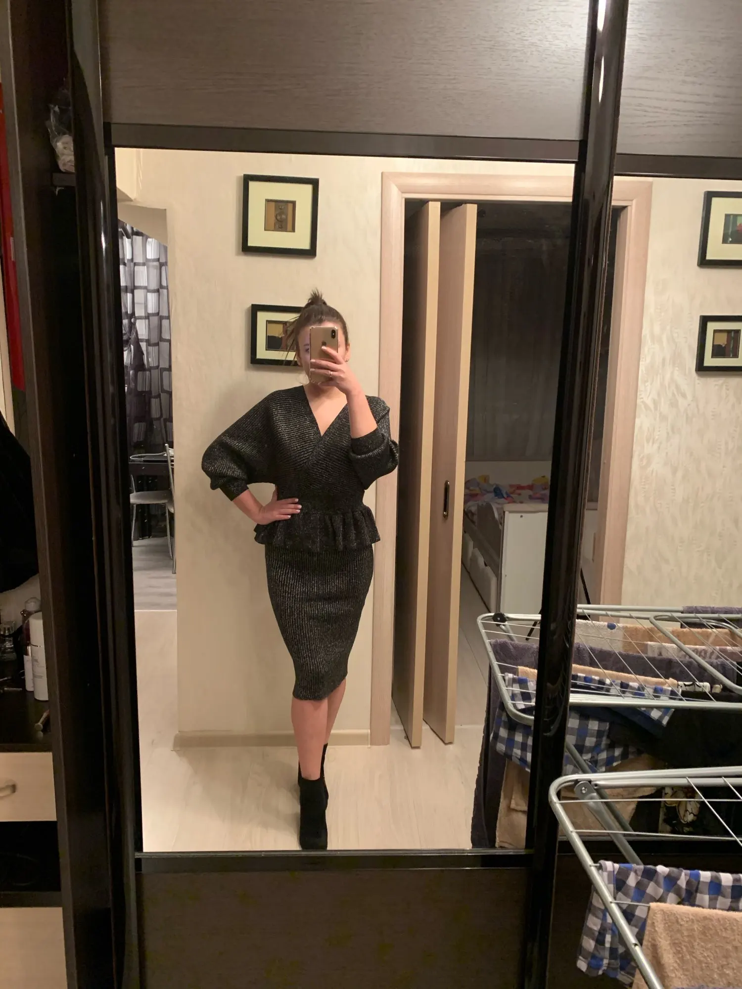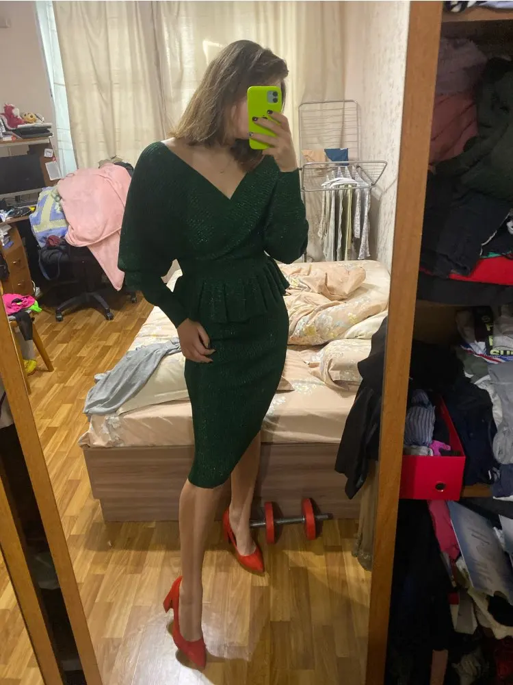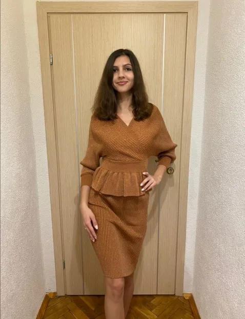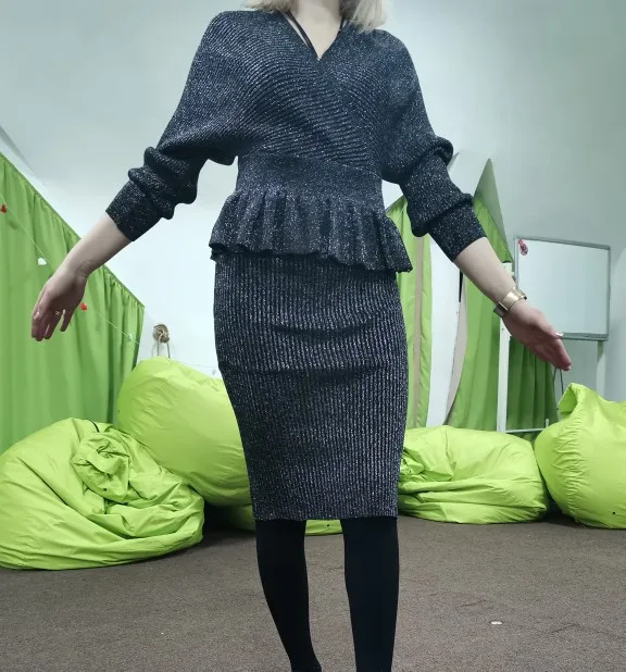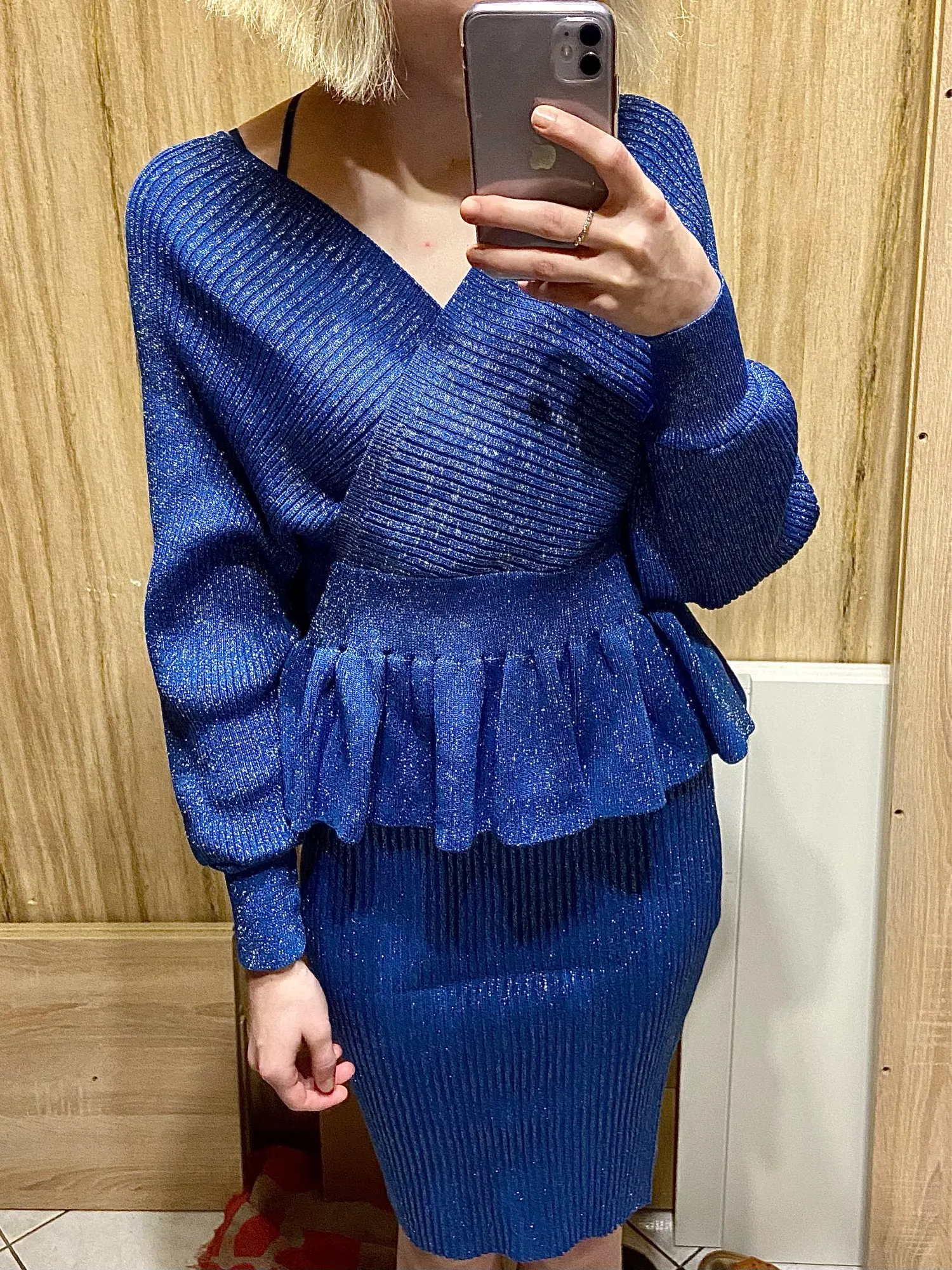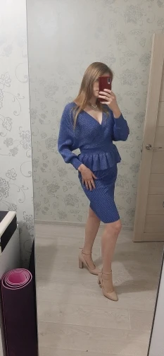Прикольный трикотажный костюм с добавлением рюлекса. Костюм очень нарядный. Воланчики на талии, и чуть приоткрытая линия декольте, создают празднично-игривое настроение. ⠀ Состав ткани акрил и полиэстер. Ткань не колючая, обычный акриловый, эластичный материал. ⠀ Качество пошива хорошее, торчало пару-тройку ниточек с внутренней стороны. ⠀ Свитер сделан, будто на запах. Сзади у свитера есть перемычка которая не дает двум частям свитера разъехаться, оставив вас в неглиже. ⠀ Рукава у свитера летучая мышь. ⠀ Юбка прямая, с широкой резинкой. ⠀ Мои параметры 84-64-90 и рост 172 см. У продавца один единственный размер данной модели. Мне этот размер маловат. Рукава коротковатые, юбка не такая длинная, как мне бы хотелось. ⠀ Доставка до Кемерово заняла 2,5 недели. Трек-номер отслеживался. Костюм не имел абсолютно никакого запаха.