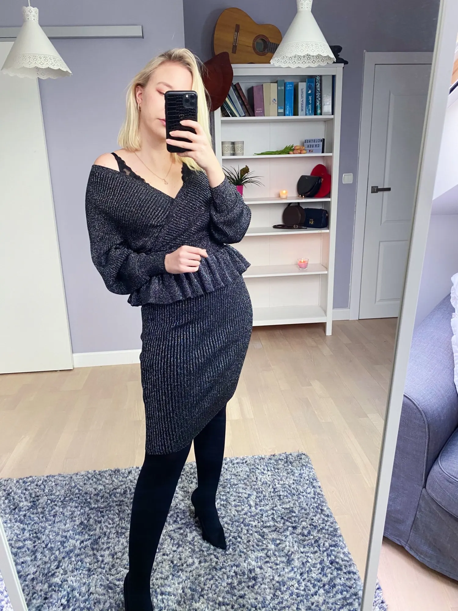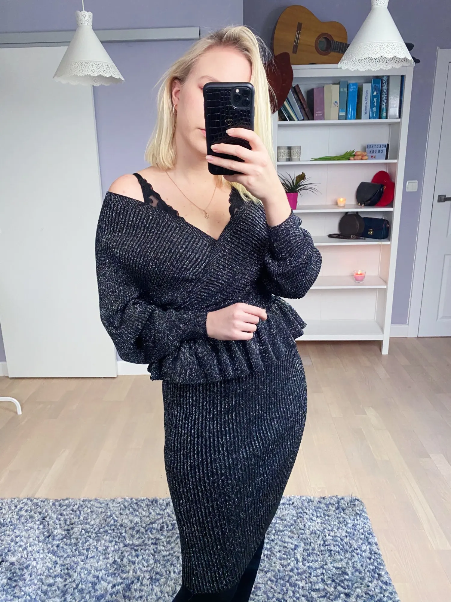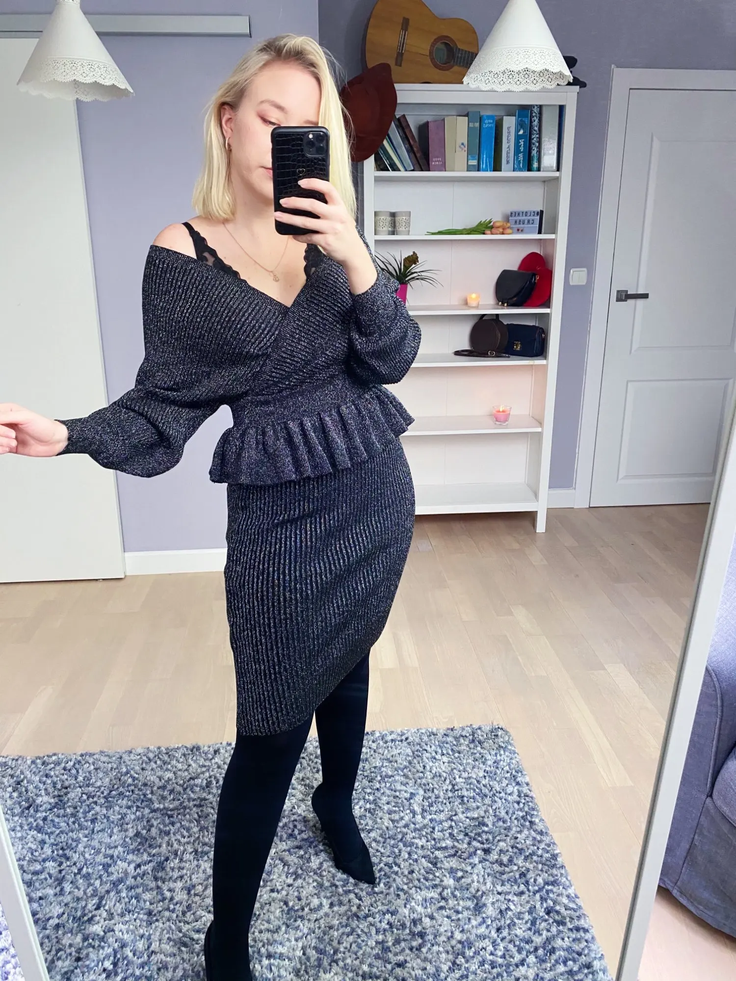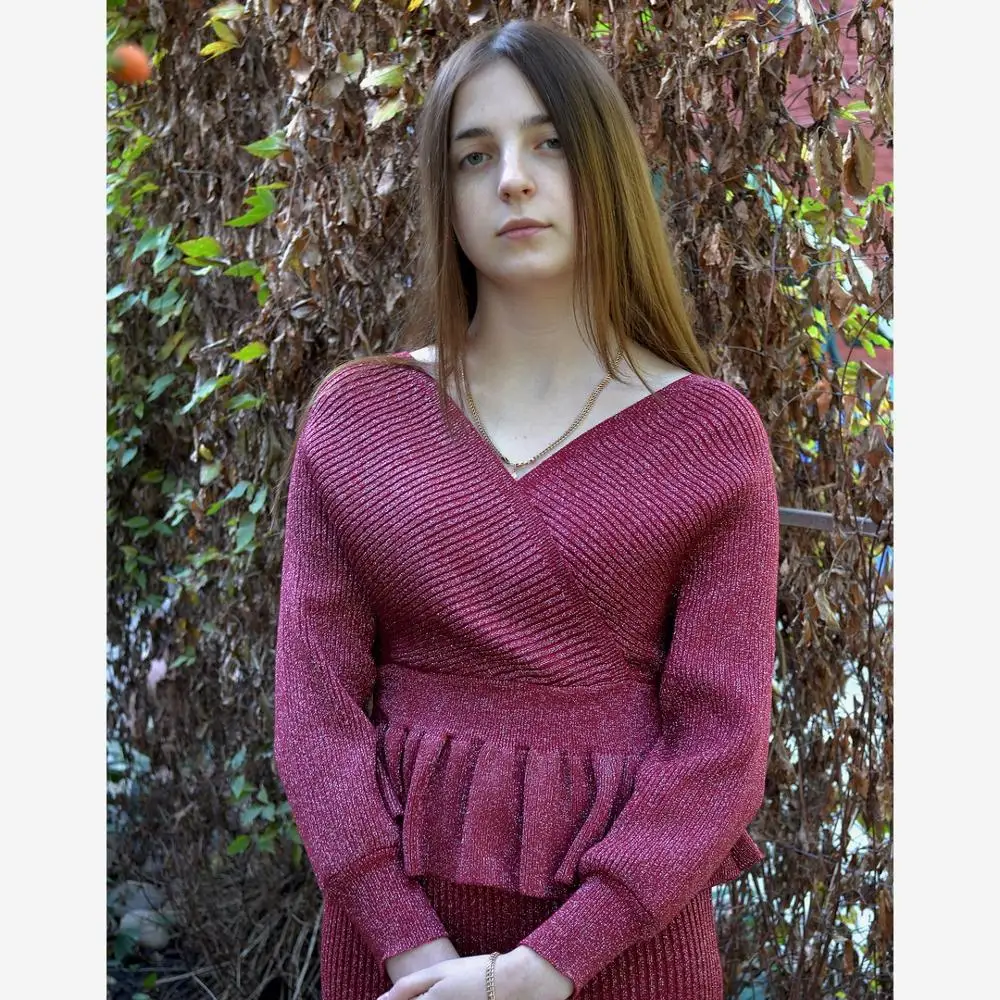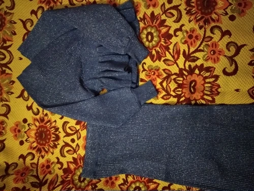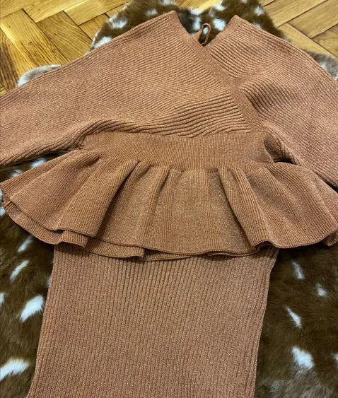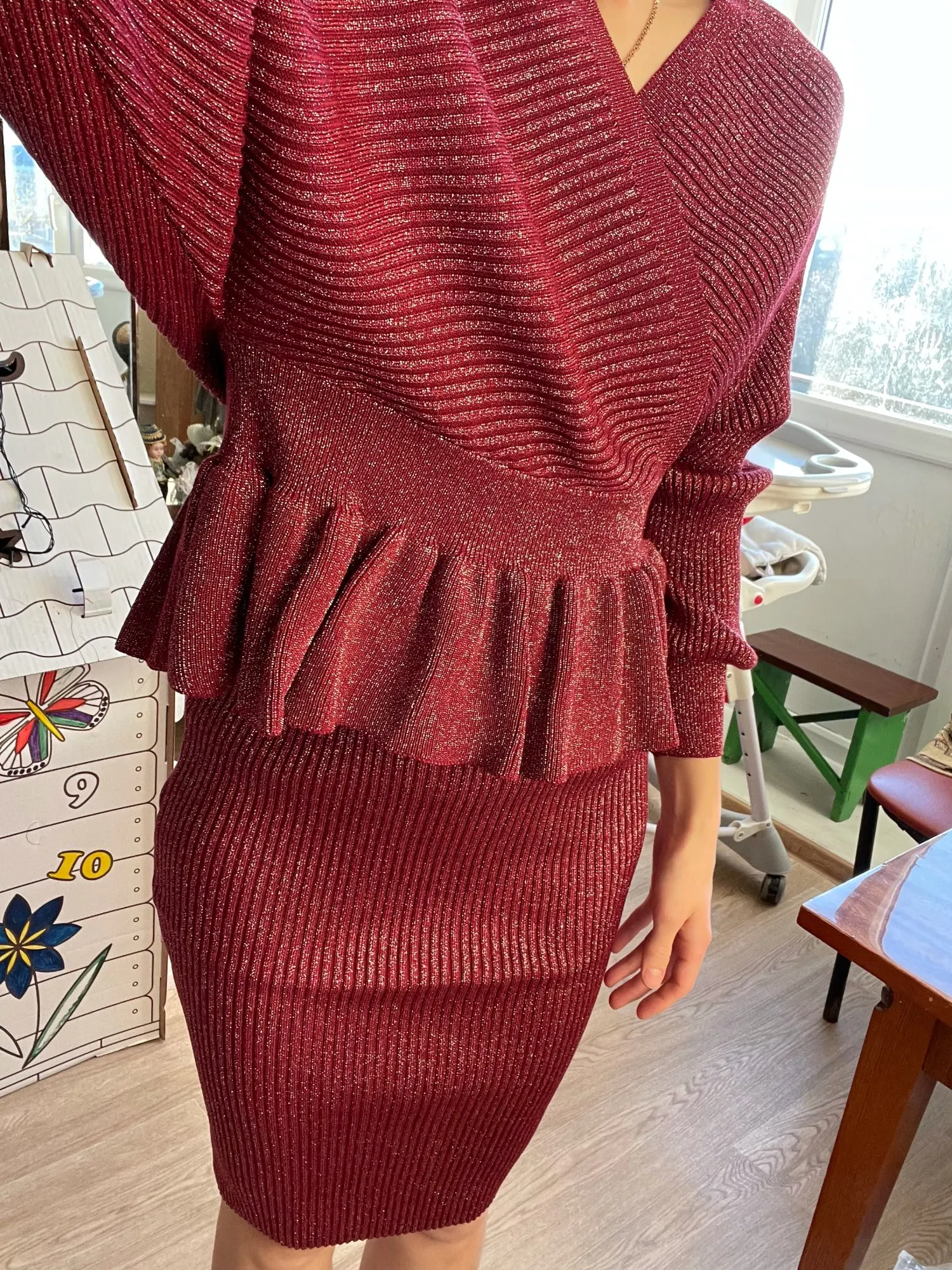 Прикольный трикотажный костюм с добавлением рюлекса. Костюм очень нарядный. Воланчики на талии, и чуть приоткрытая линия декольте, создают празднично-игривое настроение. ⠀ Состав ткани акрил и полиэстер. Ткань не колючая, обычный акриловый, эластичный материал. ⠀ Качество пошива хорошее, торчало пару-тройку ниточек с внутренней стороны. ⠀ Свитер сделан, будто на запах. Сзади у свитера есть перемычка которая не дает двум частям свитера разъехаться, оставив вас в неглиже. ⠀ Рукава у свитера летучая мышь. ⠀ Юбка прямая, с широкой резинкой. ⠀ Мои параметры 84-64-90 и рост 172 см. У продавца один единственный размер данной модели. Мне этот размер маловат. Рукава коротковатые, юбка не такая длинная, как мне бы хотелось. ⠀ Доставка до Кемерово заняла 2,5 недели. Трек-номер отслеживался. Костюм не имел абсолютно никакого запаха.