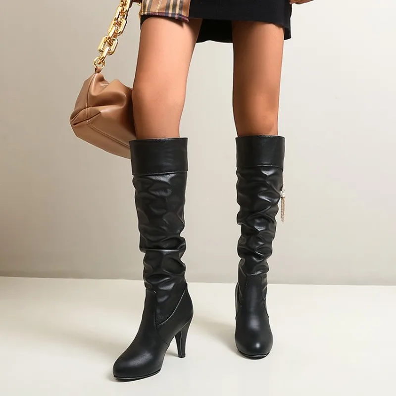 Женские Плиссированные сапоги до колена, высокие сапоги на тонком высоком каблуке, с круглым носком и бахромой, Осень-зима 2021