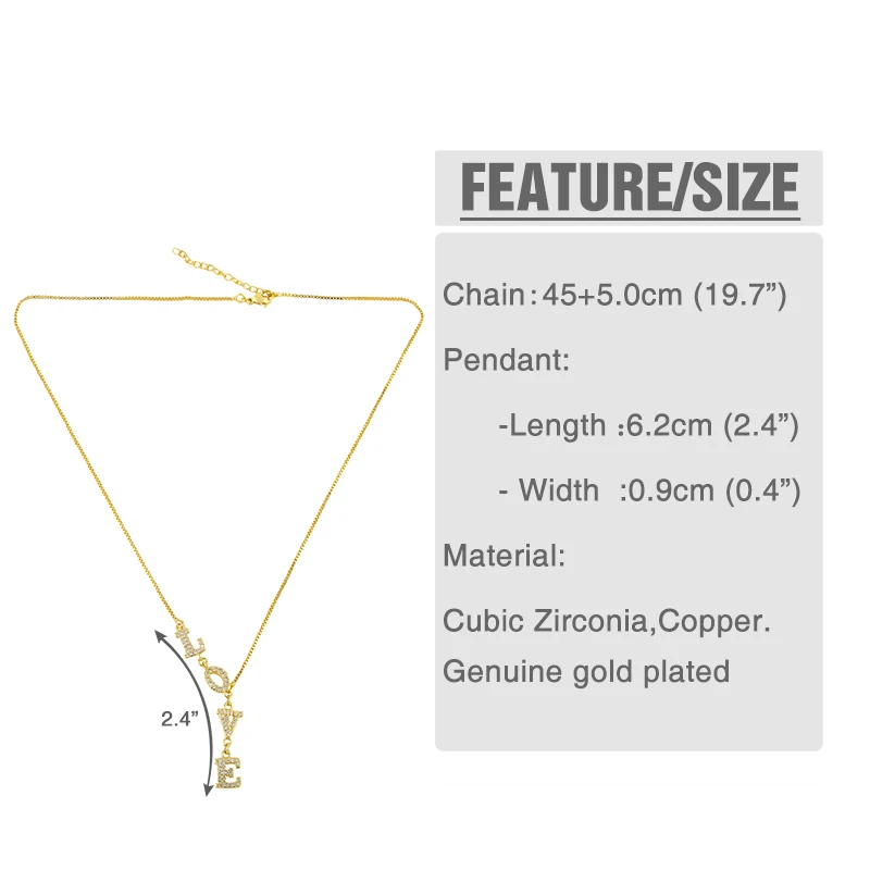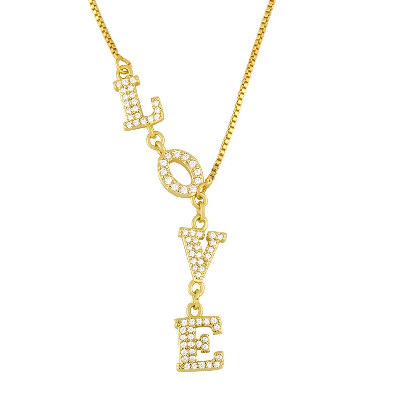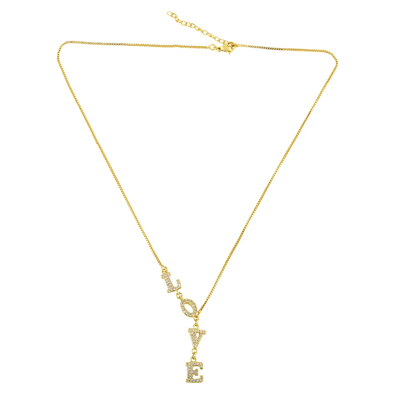 Ожерелье FLOLA с кристаллами и надписью Love для женщин, кубический цирконий, длинная цепочка, ожерелье с подвеской, Золотое массивное ювелирное изделие, подарки nker86