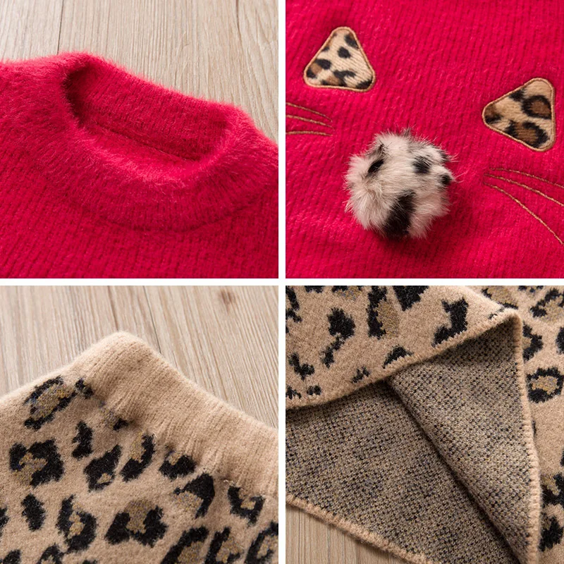 Одежда для маленьких девочек, осень и зима, теплый вязаный свитер, костюм для девочек, свитер с котом, плотная норковая флисовая юбка с леопардовым принтом, костюм из двух предметов