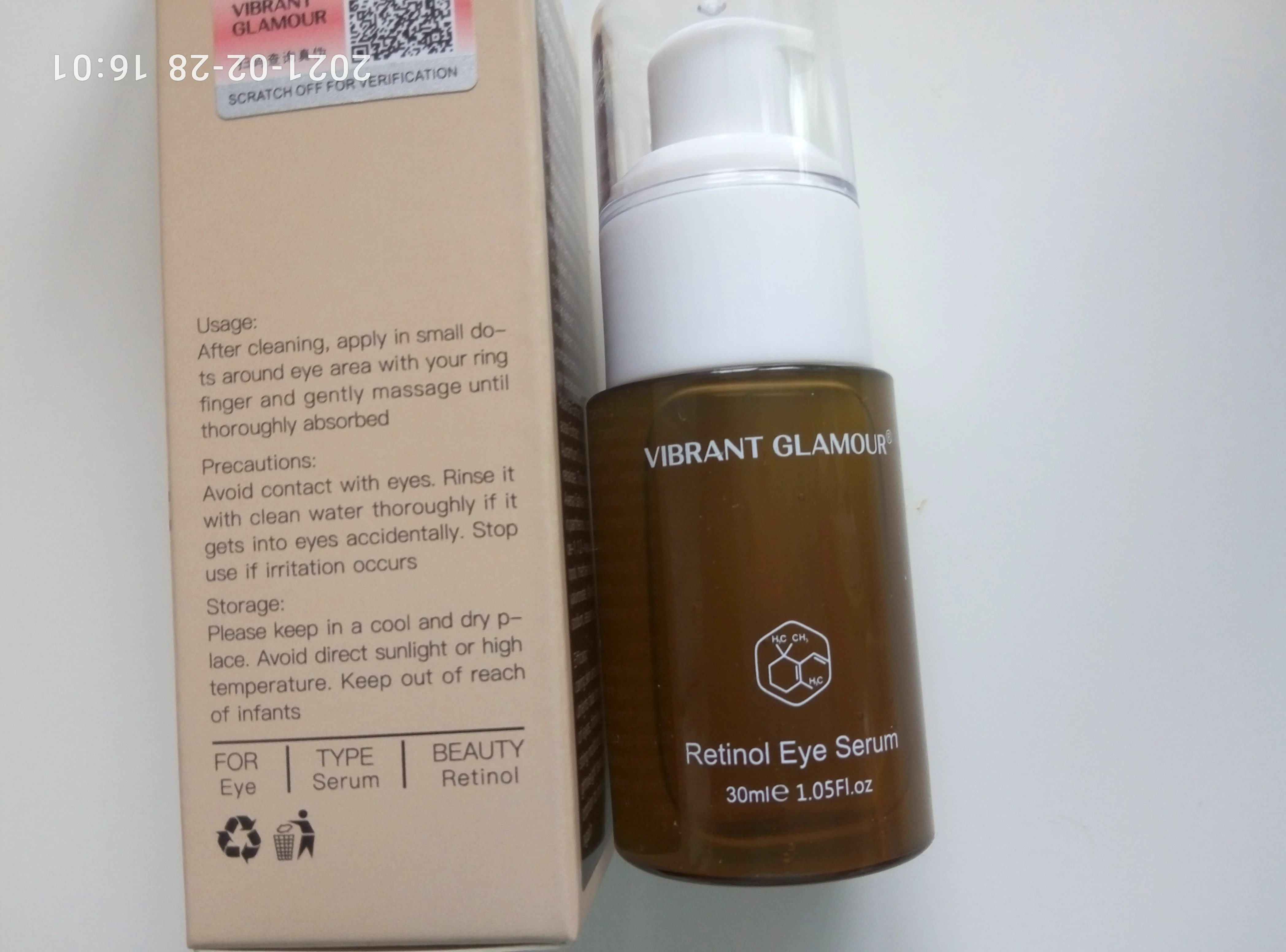 Доставка 2 месяца без отслеживания, упаковано в воздушную коробку. Сама сыворотка приходит в коробочке, которая запечатана в слюду. Срок годности до 2023 года. Жидкость непрозрачного желтоватого цвета, приятный ненавязчивый запах. Консистенция средняя по густоте, не жидкая как вода, но и не густая. Понравилось, что она совершенно не липкая. Выдавливается нажатием на кнопку сверху. Одного нажатия достаточно для двух глаз. По эффективности пока ничего не скажу. Но при первом нанесении сразу подтянулась кожа вокруг глаз, а дальше посмотрим. Алергической реакции нет. Во флаконе 30 мл. Материал флакона пластик.