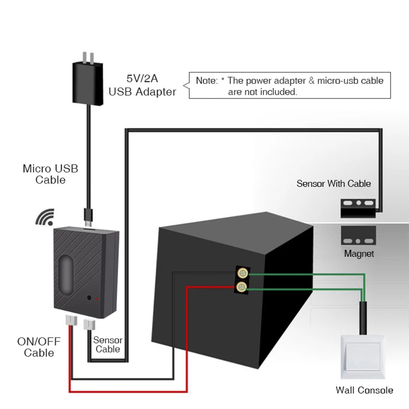 1. Подключите устройство к адаптеру 5 в постоянного тока и микро-usb-кабелю. 2. Подключите красные и черные провода к открывателю двери гаража: Поместите каждый конец на те же клеммы, что и провода кнопки стены, прекращены. 3. Подключите датчик и установите его на двери гаража с помощью винтов/наклеек/кронштейнов и так далее. 4. Управляйте устройством на вашем смартфоне.