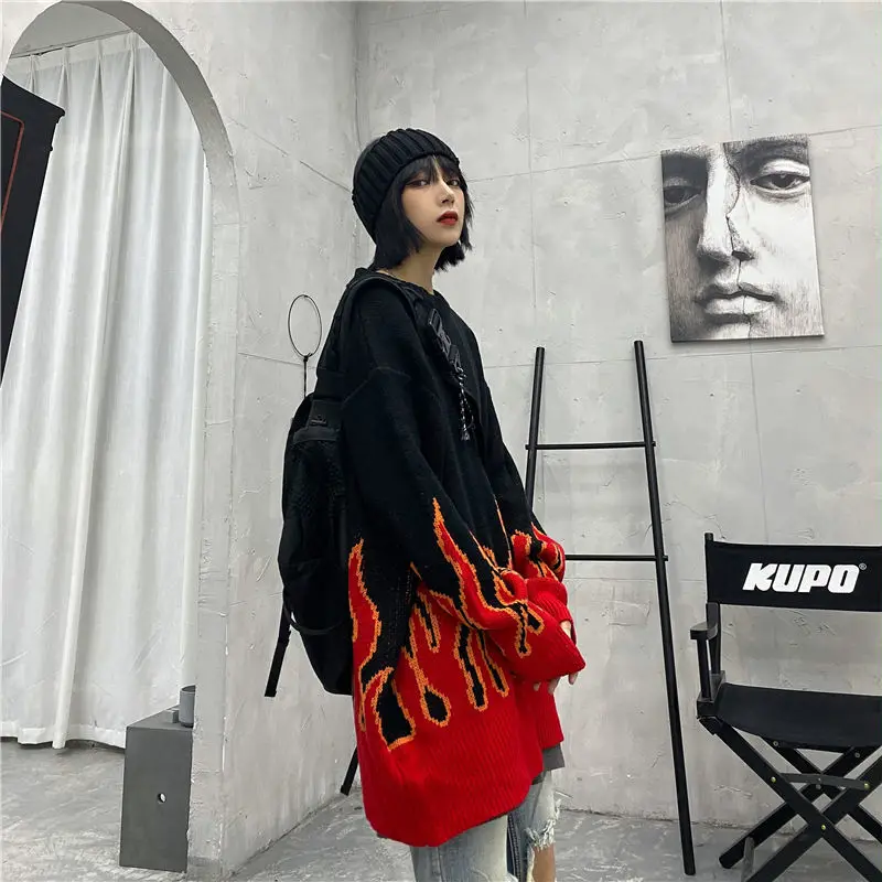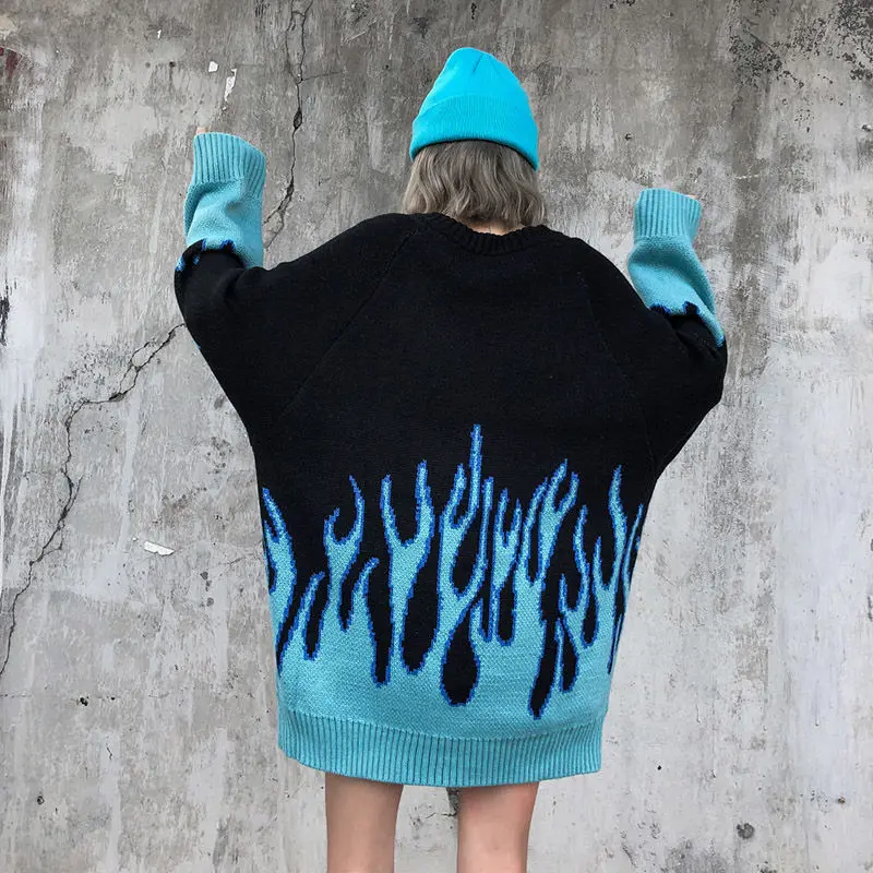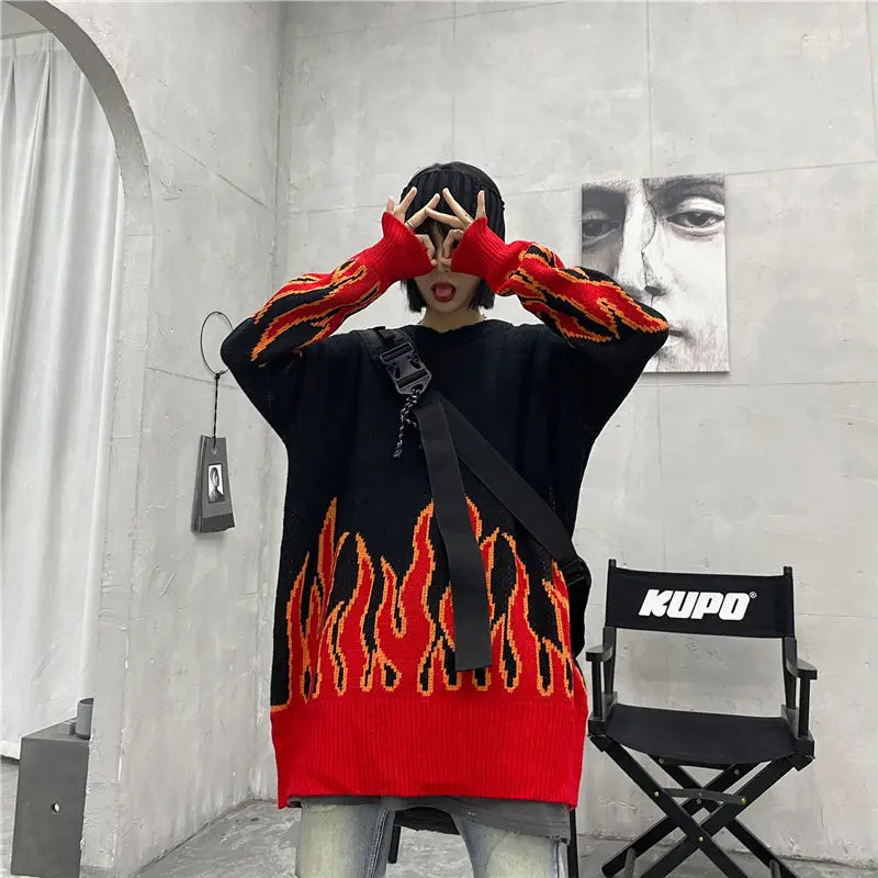 Свитер женский в стиле хип-хоп, жаккардовый свитер с эффектом пламе...