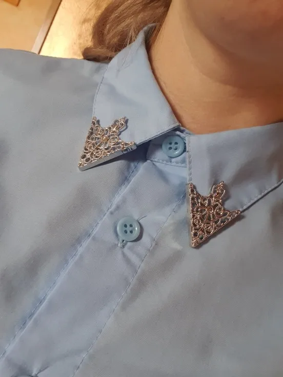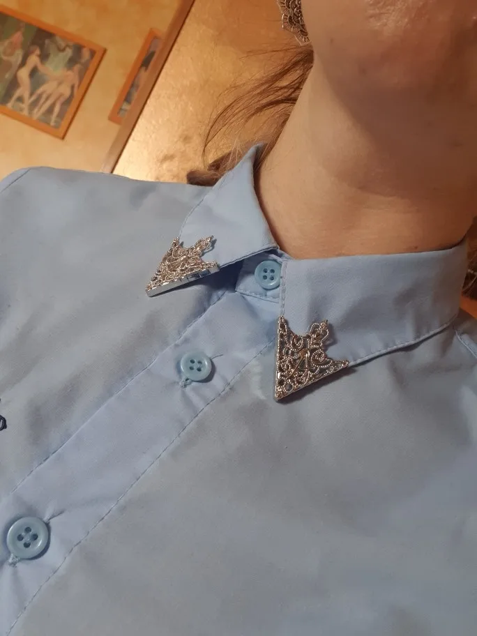 Мне понравились эти насадки на воротник. К платью не подошли, слишком тяжёлые, из-за чего переворачивались, а вот на рубашке отлично смотрятся.