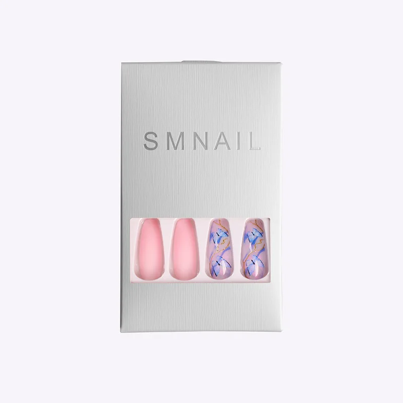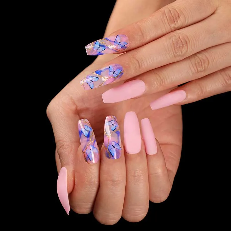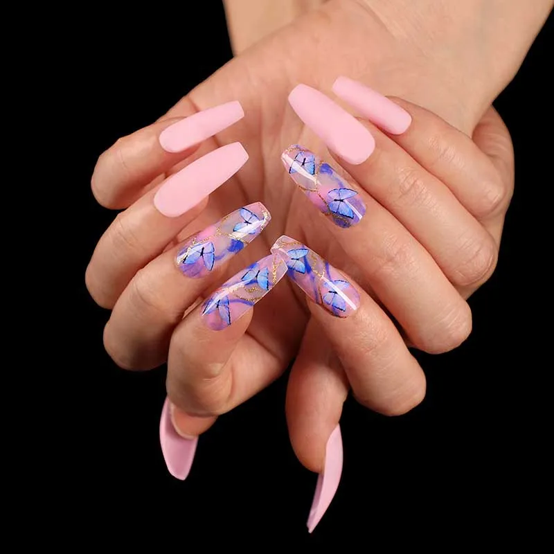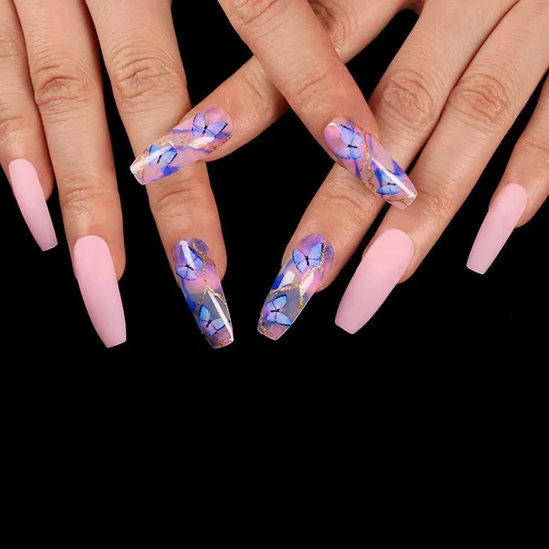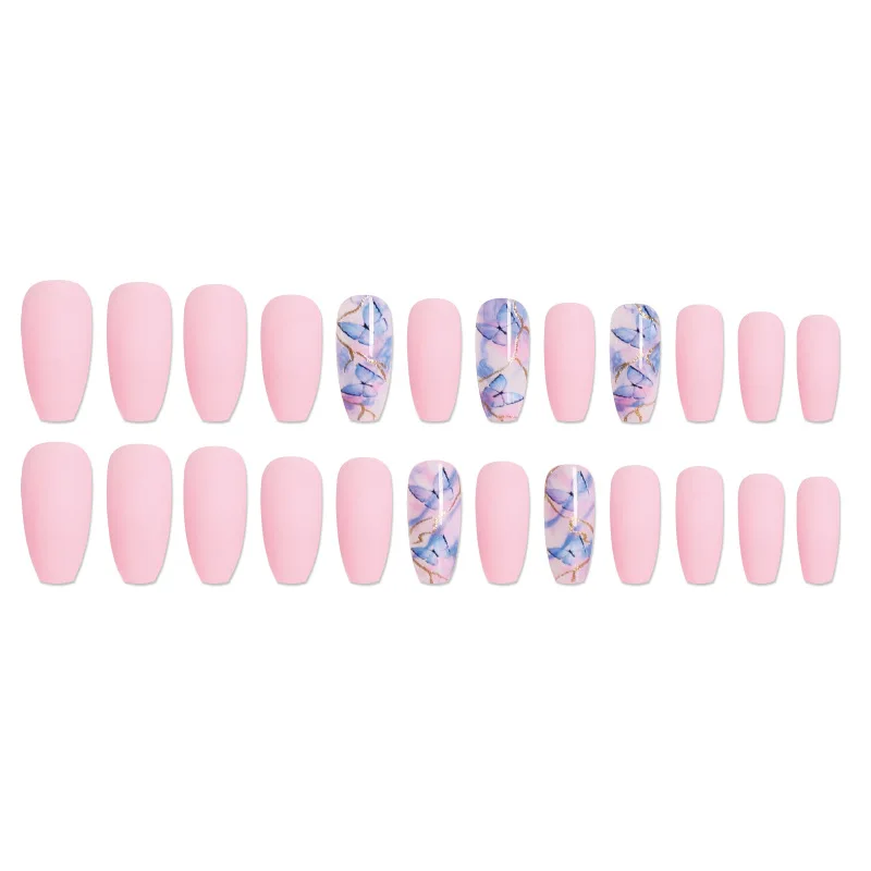 24 шт.коркор. Длинные акриловые накладные ногти розового цвета с полным покрытием и рисунком бабочки для женщин и девочек