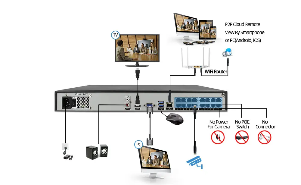 Нет дополнительных кабелей питания или адаптеров, просто подключив ip-камеру к NVR с помощью одного кабеля,