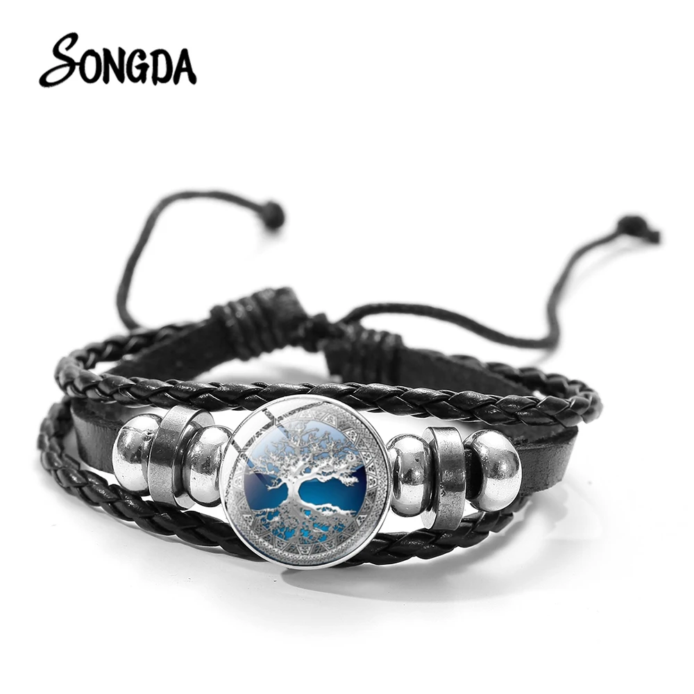 Кожаный браслет с изображением богатого дерева жизни, регулируемый браслет ручной работы, искусство, картина, стекло, кабошон, кнопка, амулетный браслет, счастливый семейный подарок