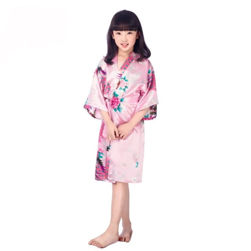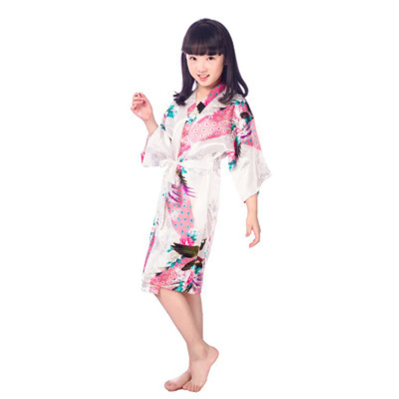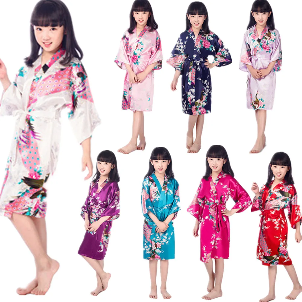 Оптовая продажа, Детская атласное кимоно; Наряд для девочек, детская пижама с цветочным принтом, халат с цветочным принтом для спа, свадьбы, дня рождения, ночная рубашка