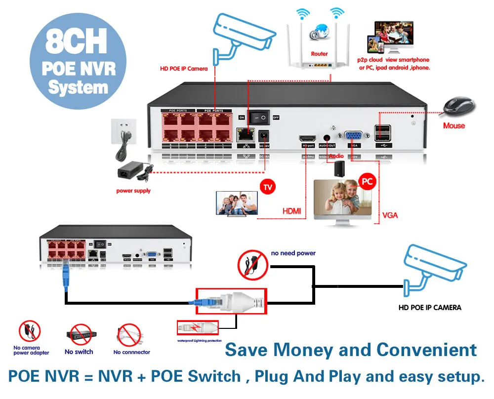 Нет дополнительных кабелей питания или адаптеров, просто подключив ip-камеру к NVR с помощью одного кабеля, вы можете легко завершить установку без знания о компьютере или сети и начать наслаждаться супер простым мониторингом среди вашего смартфона, планшета или ПК.Экономьте деньги и удобный POE NVR = NVR + POE коммутатор, подключи и работай и простая настройка!