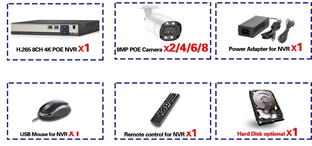 1 сетевой видеорегистратор H.265 8CH 4K & 8MP POE NVR;2/4/6/8 X H.265 HD POE аудио 8.0MP IP камера для дома и улицы ИК Ночного Видения Всепогодные камеры;1 x Блок питания для NVR;1 х USB мышь для NVR;1 компакт-диск программного обеспечения для NVR;1 пульт дистанционного управления для NVR;Жесткий диск опционально!