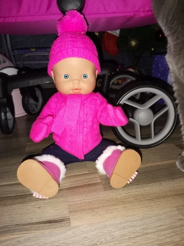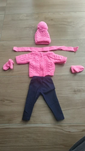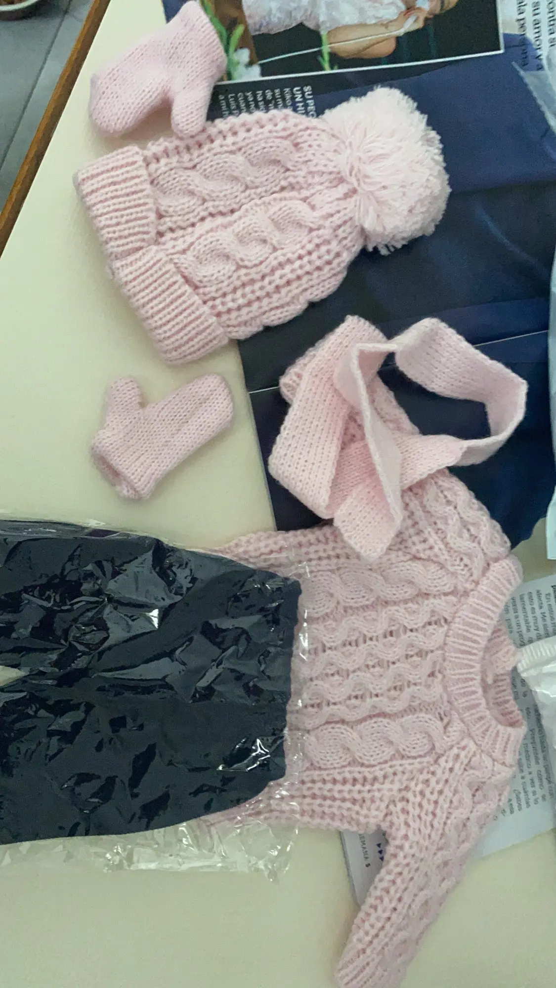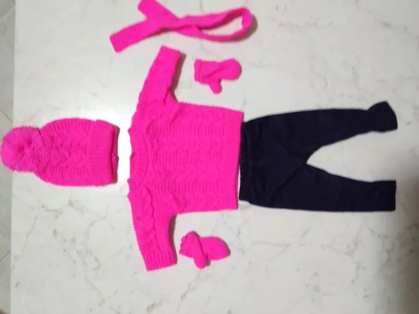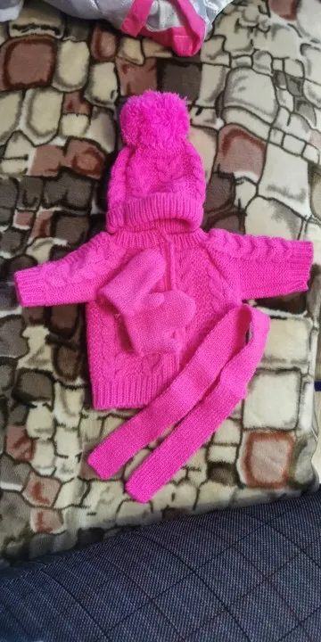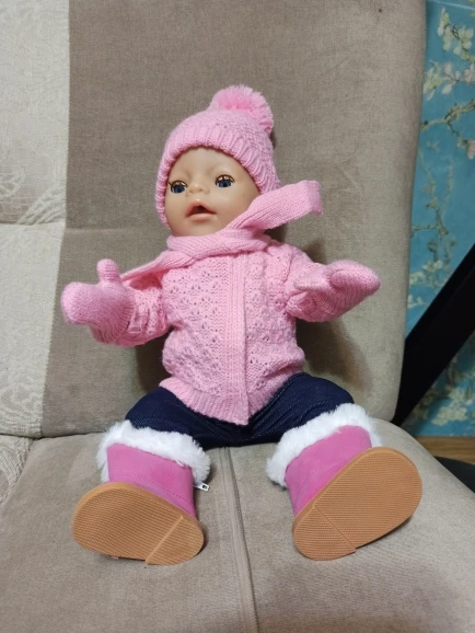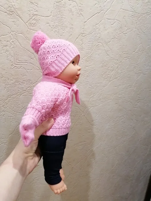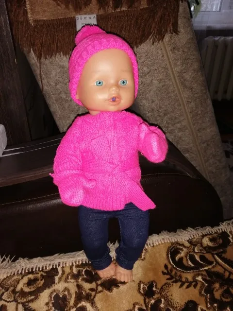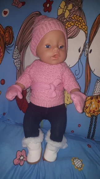 все соответствует описанию. Очень быстрая доставке, товар качественный. На куклу Bebi Born как раз. В комплекте: шапка, кофта, шарф и две варежки. Кофта на лепучке по всей длине, варежки даже сделаны под большой палец. Товаром очень довольны, будем заказывать ещё.