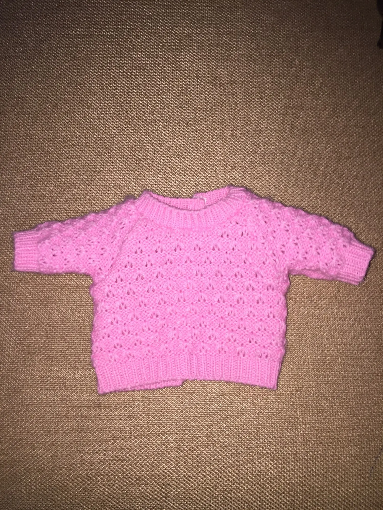 подошло на куклу 35 см и на пупса 43 см. на пупса впритык, на кукле свободно. Дочери понравилось, качество хорошее. Свитер сзади на липучке