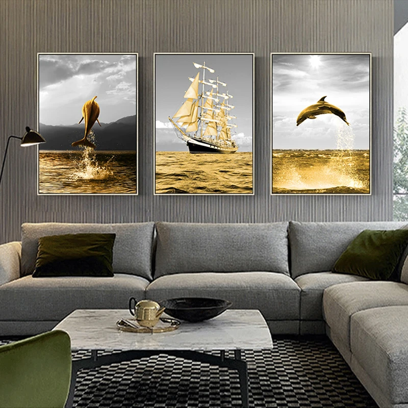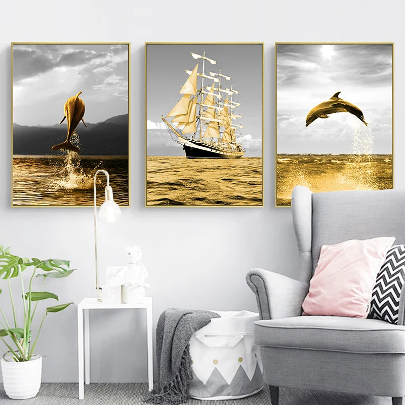 Комплект из 3 предметов золотые океана Дельфин парусник Картины домашний декор холст картины стены искусства с модульная рамка плаката Гостиная