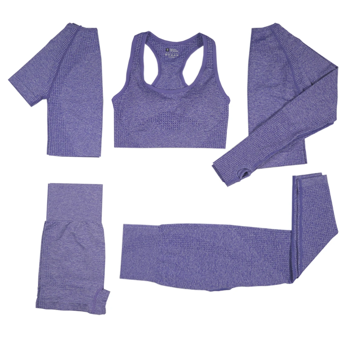 Женский бесшовный комплект для йоги, комплект из 5 предметов, спортивный костюм для фитнеса, футболка для йоги, леггинсы с высокой талией, бюстгальтер и шорты, штаны для тренировок
