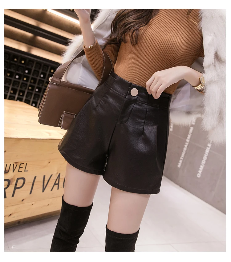 LJSXLS корейские модные широкие кожаные шорты для женщин 2020 осенние зимние однотонные повседневные тонкие женские шорты из искусственной кожи с высокой талией