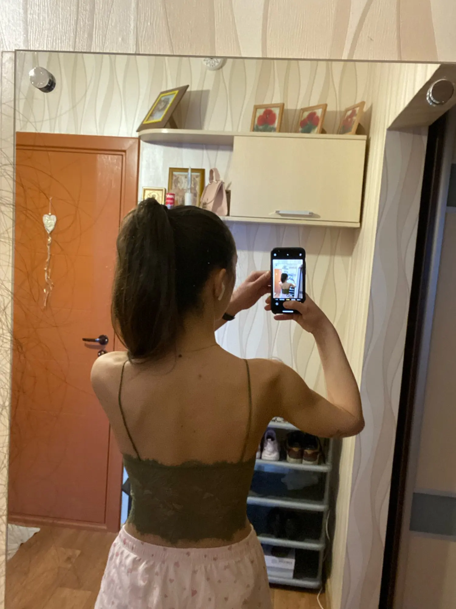 Маечка хорошенькая, коротенькая. Максимум на 44 размер, тянется плохо