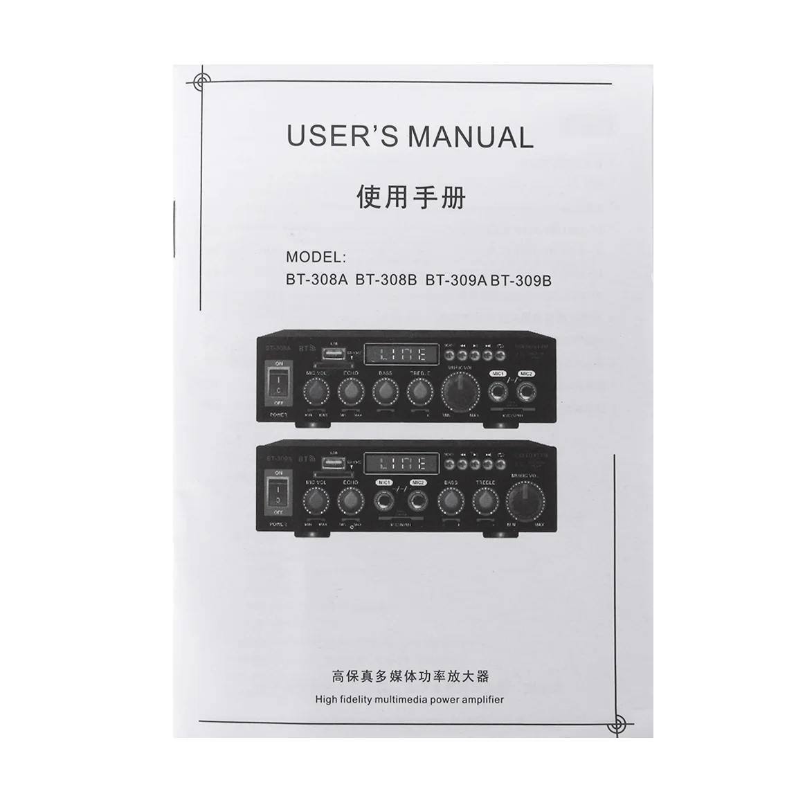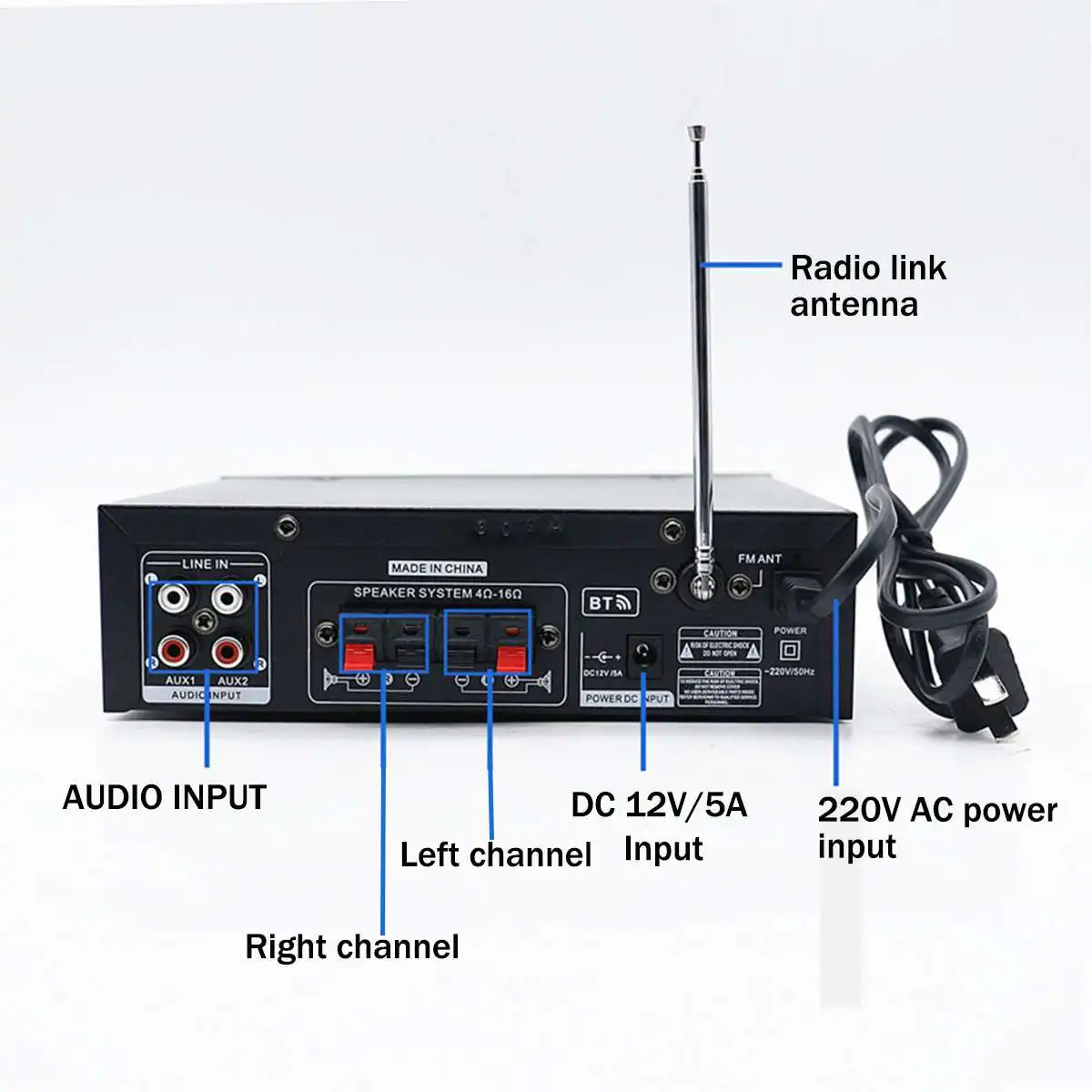 Характеристика:1) Эта машина имеет два входных канала микрофона. Общий дизайн основан на требованиях к комнате. Процессор Kara OK effect использует 24 бит. Высокоскоростной чип ADC DAC 96 khz обрабатывает человеческие голосовые эффекты, делая пение более естественным и красивым2) mp3-плеер с USB палкой и sd-картой, fm-радио с автоматическим каналомФункция поиска.3) Встроенный MP3-плеер с функцией приема инфракрасного пульта дистанционного управления.4) Встроенная функция приема Bluetooth.5) Эта машина имеет идеальные меры защиты-Система защиты от короткого замыкания на выходе.-Защита от перегрева.