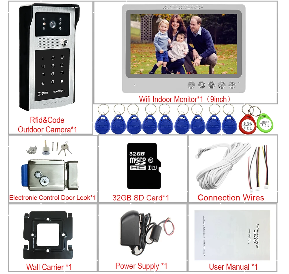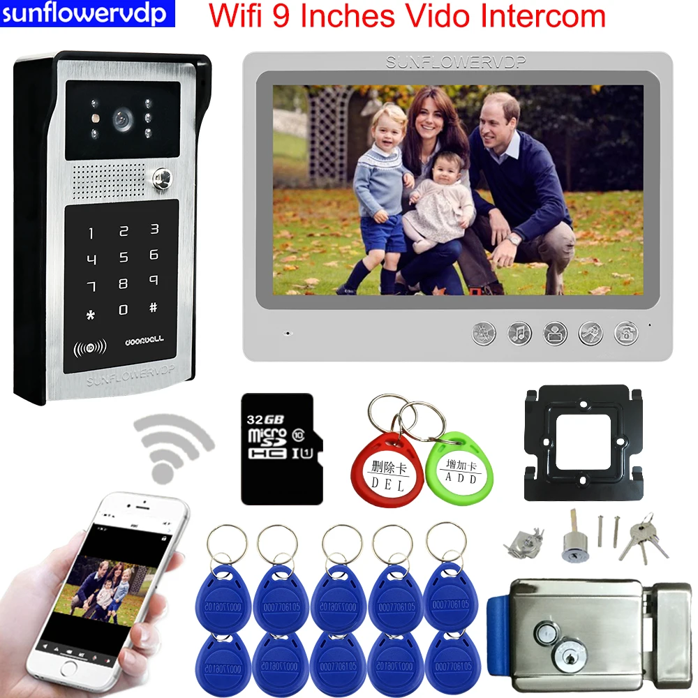 Домофон Wifi 9 "видеодомофон Rfid код разблокировки + 32 ГБ sd-карта видеодомофоны для квартиры + электронный дверной замок