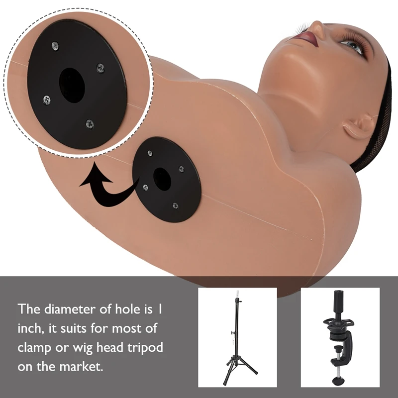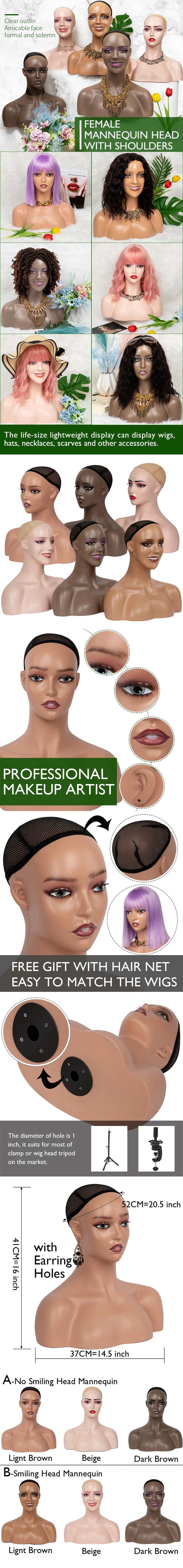 Описание головы манекена1. Несколько видов применения: Эта профессиональная голова манекена предназначена для демонстрации париков, солнцезащитных очков, шляп, украшений, шарфов. Эта голова манекена имеет отверстие в ухе, и вы можете отображать все виды сережек. Длинная тонкая горловина манекена поможет подчеркнуть любые аксессуары, которые носятся на дисплее.2. Внимательный дизайн: На манекеновой головке есть сетчатая крышка, которая может держать любые парики на месте и предотвратить его скольжение. Под головкой манекена есть отверстие, которое можно зафиксировать на подставке для штатива.3. Материалы: Реалистичный манекен женщина голова сделана из высококачественного ПВХ, он прочный и долгое время использования, он не сломается во время падений.4. Красивый внешний вид и цвет лица: Голова манекена имеет реалистичный красивый вид, с ресницами, помадой и макияжем. В наличии 3 различных цвета: темно-коричневый, коричневый, бежевый, светильник.5. У нас есть два стиля на ваш выбор. Один без улыбки, один с улыбкой, выглядит более красиво6. Лучший Сервис: Если есть какие-либо проблемы с манекеновой головкой, например, с ошибками, поврежденными, пожалуйста, свяжитесь с нами, мы можем помочь решить эту проблему.