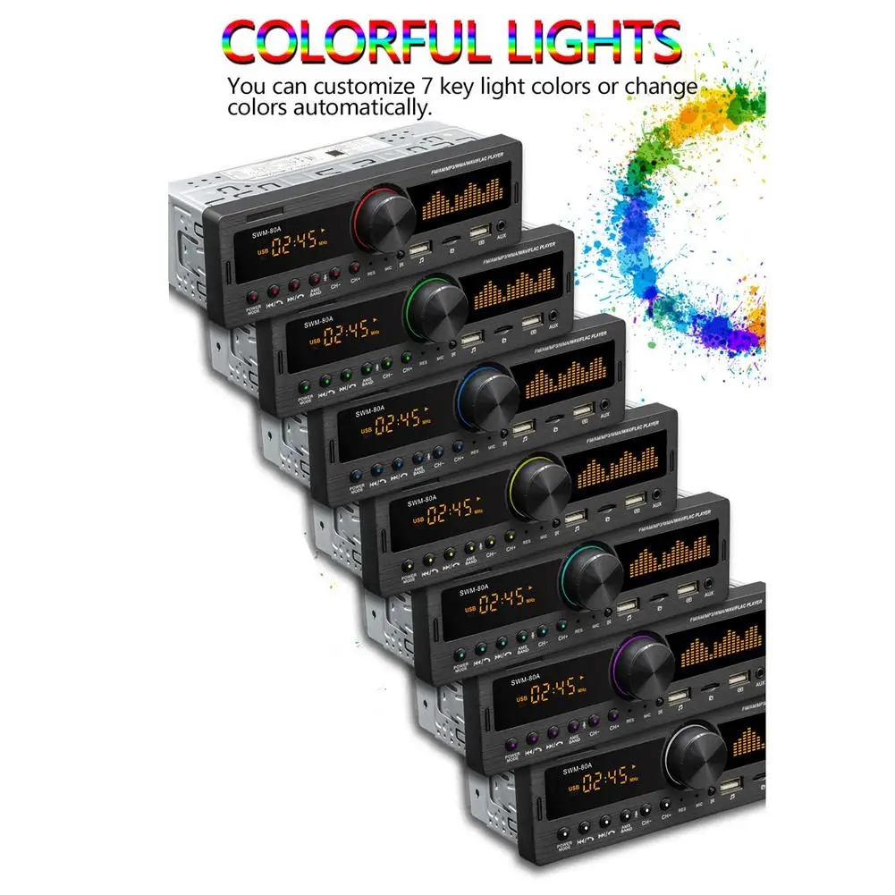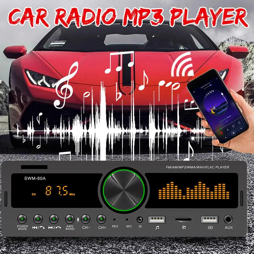 5. Один Din Bluetooth стерео MP3-плеерОсобенности:1. Bluetooth для воспроизведения музыки Bluetooth для совершения и приема звонков и функции AUX.2. Цифровое высококачественное FM/AM стерео радио.3. Поддержка картридера и u-диска (аудио).4. Поддержка аудио: MP3/WMA/WAV/FLAC.5. Аудиовыход RCA может быть подключен к сабвуферу.6. Красочные прохладные огни.7. Функция копирования аудио, поддержка записи источника звука, вы можете Непосредственно копировать радио-и AUX музыку и Bluetooth на U-диск.8. Поддерживает мобильный телефон, приложение, местоположение и функцию поиска автомобиля, голосовое управление, мобильный телефон, голосовой помощник.Характеристики:Тип: автомобильный стерео MP3-плеерСпециальная функция: FM /AM радио, Bluetooth, Hands-free Звонки, mp3-плеер, AUX, двойная USB зарядка,Модель: SWM-80AНапряжение: 12 ВОС: нетПрограммное решение: SWT6D801Чип усилителя: TDA7388Тип экрана: светодиодный цифровой трубка + экран частотыРазмер панели (около): 188*58 мм/7,40*2,28"Панельный светильник: Красочный переменный светильникРазмер коробки (около): 220*82*181 мм/8,66*3,23*7,13"Глубина хоста: 60 ммВес одной машины (около): 418 гРадио диапазон: FM 87,5 ~ 108 МГц/A522 ~ 1620 кГцРадиочип: ZT0811Мощность: 4*60 ВтSNR (дБ): ≥ 60 дБСтепень искажений (%): ≤ 0.3%Чувствительность: менее 20 дБСтерео разделение: более 25 дБРабочая температура: -10 ~ 60 ° CМодель Bluetooth: AUTO BTВерсия Bluetooth: 4,0Слот для tf-карты: ДаПульт дистанционного управления: ПоддержкаИнтерфейс USB и версия: USB2.0Кнопка: Физическая кнопкаRca-клеммное введение: 4-канальный аудио выходAUX аудио вход: ДаПоддерживаемые Аудиоформаты: MP3 / WMA / WAV / FLACУпаковочный лист:1 х mp3-плеер1 х шнур питания1 х Акустический кабель2 x ключ для удаления1 пульт дистанционного управления1 х РуководствоПримечания:1. Этот продукт является машиной 12 В, не в соответствии с источником питания 24 В.2. Возможны незначительные отклонения в размере из-за ручного измерения, различных методов измерения и инструментов.3. Цвет, показанный на фотографиях, не соответствует фактическому цвету товара из-за различий в фотографировании светильник, углы и мониторы.