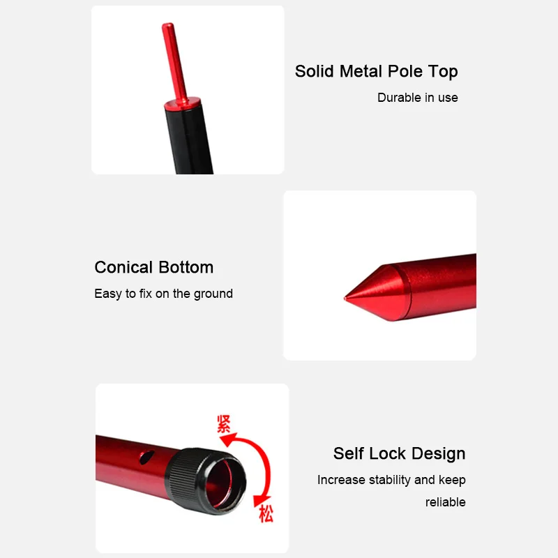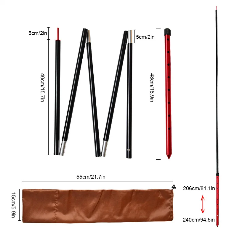 Особенности:2 шт. штанги, каждый стержень включает 3 сегмента.Устойчивая к коррозии конструкция из алюминиевого сплава, высокая прочность и хорошая прочность.Телескопическая конструкция позволяет регулировать высоту от 35,4 ''-90,6''.Двойные отверстия на головке полюса могут быть использованы для фиксации ветровой веревки.Прочный щебень в нижней части удерживает полюс от скольжения.Поставляется с прочным чехлом для переноски.Каждая секция полюса тщательно обрабатывается для плавного соединения для вашей действительно быстрой установки/снятия.Идеальный аксессуар для кемпинга, альпинизма, походов, путешествий, пикника, гамака, укрытия или навеса.Характеристики:Материал: алюминиевый сплавЦвет: красный/черный/серебристый (опционально)Количество: 1 шт/2 шт (опционально)Длина: 230 см/250 см (опционально)230 смРазмер изделия: 90 - 230 см/35,4-90,6 дюймаСегмент: 3Внешний Диаметр: 29 мм/1,14 в, 25,5 мм/1,00 в, 22,2 мм/0,87 вУпаковка Размеры: 90*3 см/35,4*1,2 вПосылка Вес: 1,2 кг/2,6 фунтов лёгкий нейлоновый трос250 смРазмер изделия: 85 - 250 см/33,5-98,4 дюймаСегмент: 4Внешний Диаметр: 19 мм/0,7 в, 22,5 мм/0,9 в, 25,5 мм/1,0 В, 30 мм/1,2 вУпаковка Размеры: 97*9,5 см/38,2*3,7 вПосылка Вес: 1,32 кг/2,9 фунтов лёгкий нейлоновый тросПосылка:2 * шатер2 * водонепроницаемая крышка