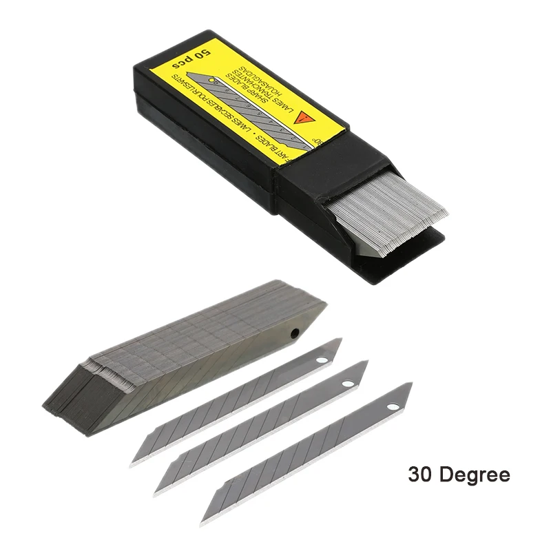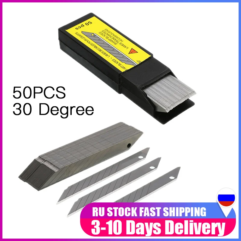 50 шт., автомобильные наклейки из углеродистой стали с защелкой и декором, режущее лезвие, 30 градусов, 9 мм, виниловая пленка, художественный нож, Запасное лезвие