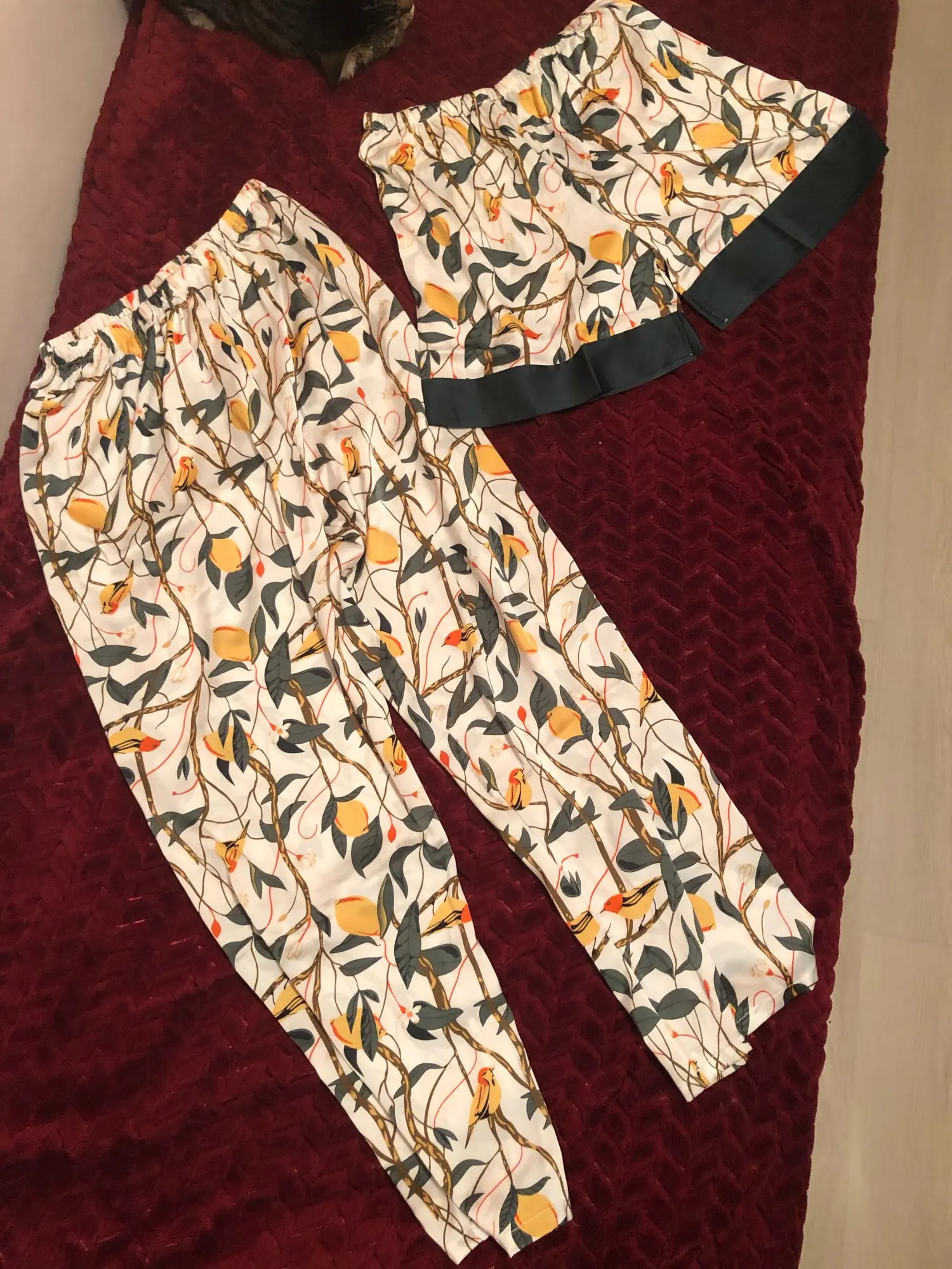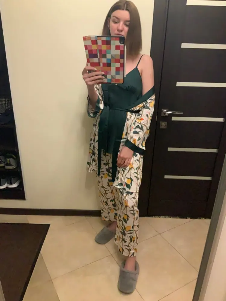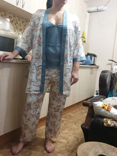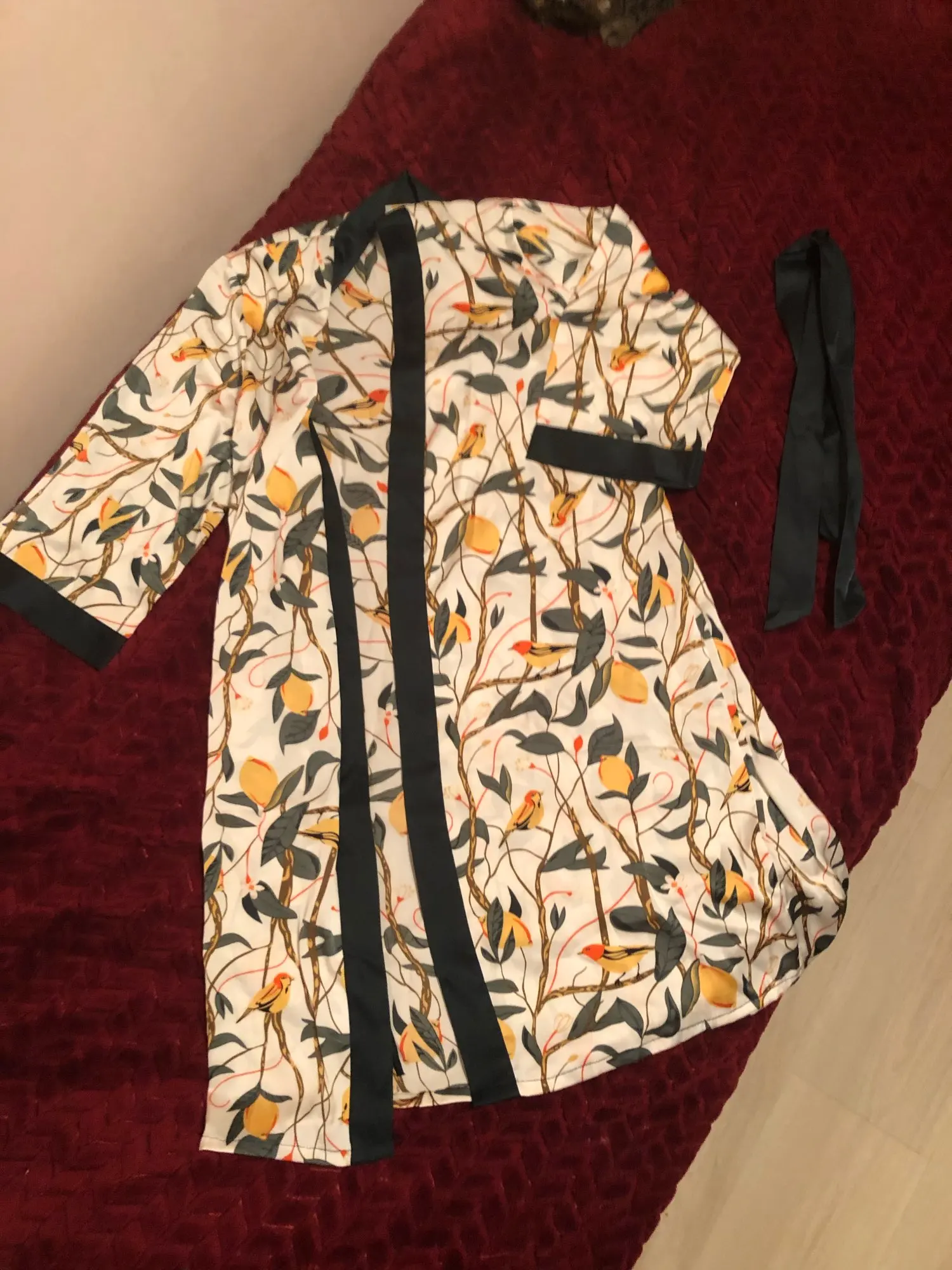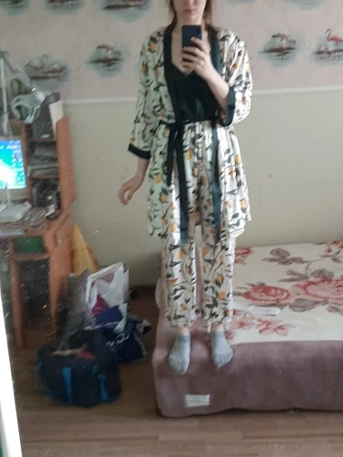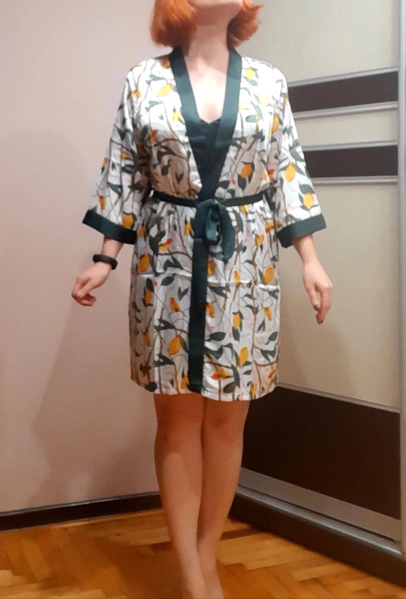 Просто замечательный комплект)) И так для такого комплекта стоит недорого, а с купоном али так вообще здорово) Лимончики и птички супер, глубокий зеленый цвет) Ткань типо шелк. Халат на рост 167 чуть выше колен. Как по мне лучше заказывать на размер побольше, так приятнее сидит на теле)