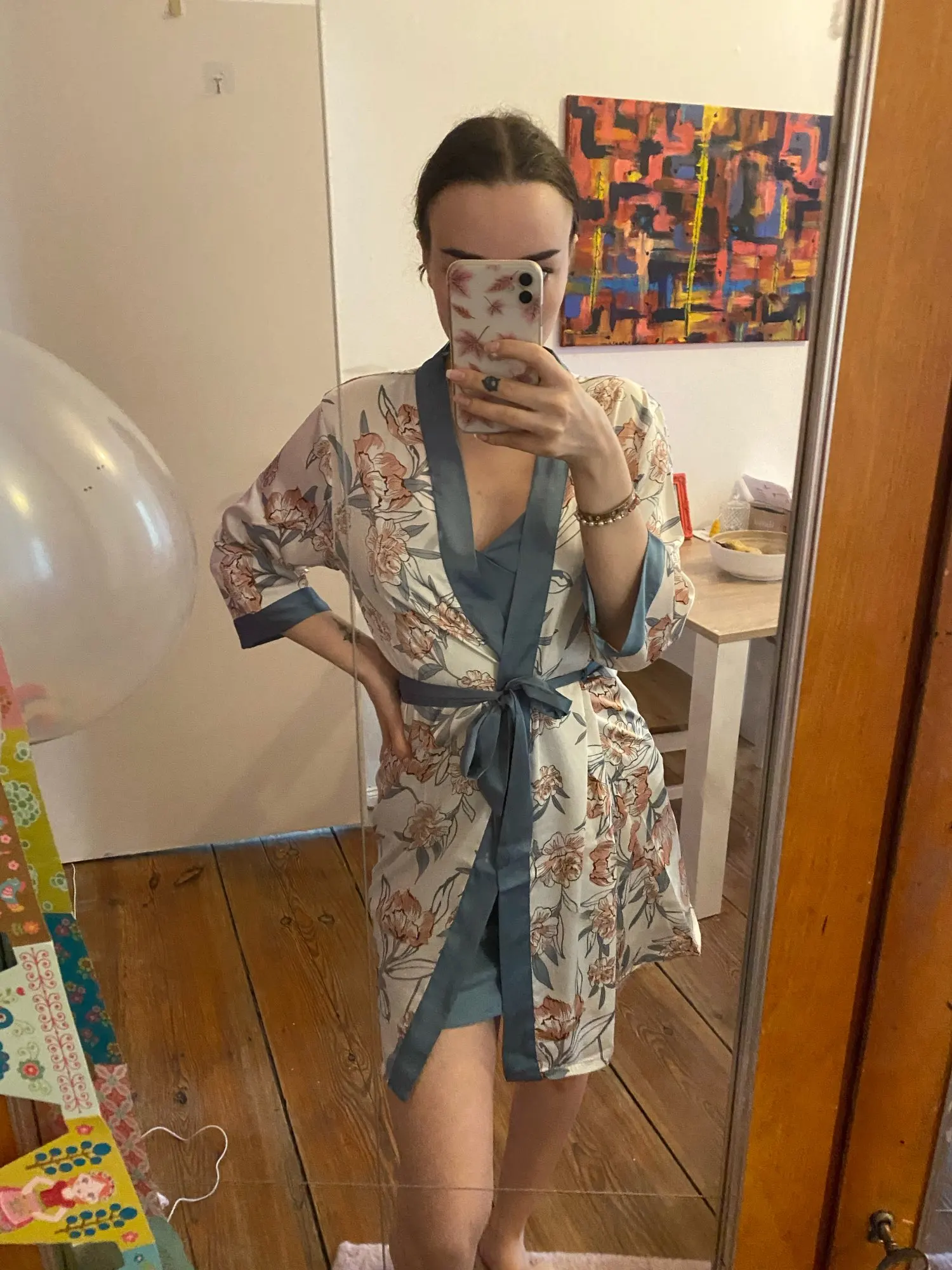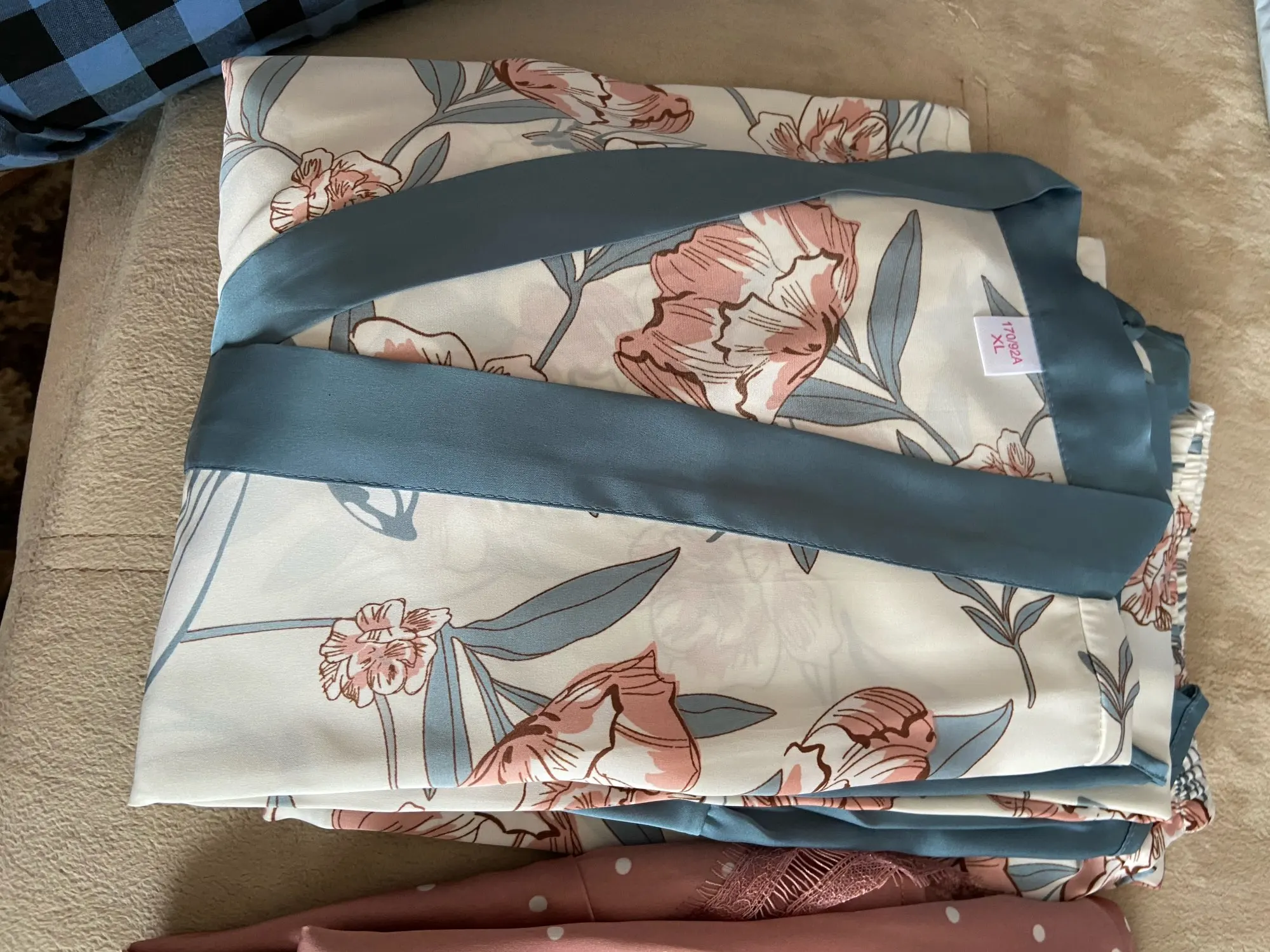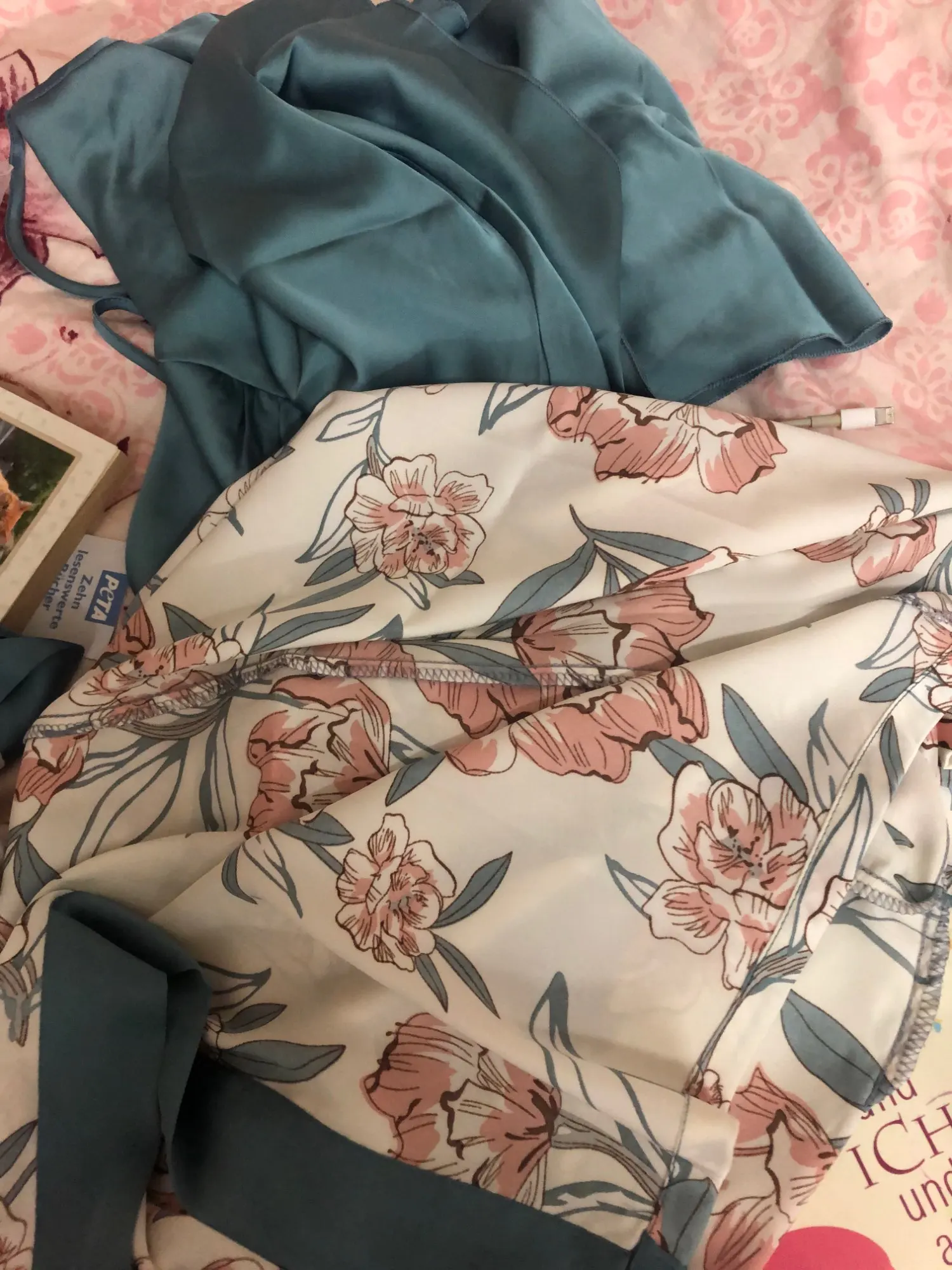 Просто замечательный комплект)) И так для такого комплекта стоит недорого, а с купоном али так вообще здорово) Лимончики и птички супер, глубокий зеленый цвет) Ткань типо шелк. Халат на рост 167 чуть выше колен. Как по мне лучше заказывать на размер побольше, так приятнее сидит на теле)