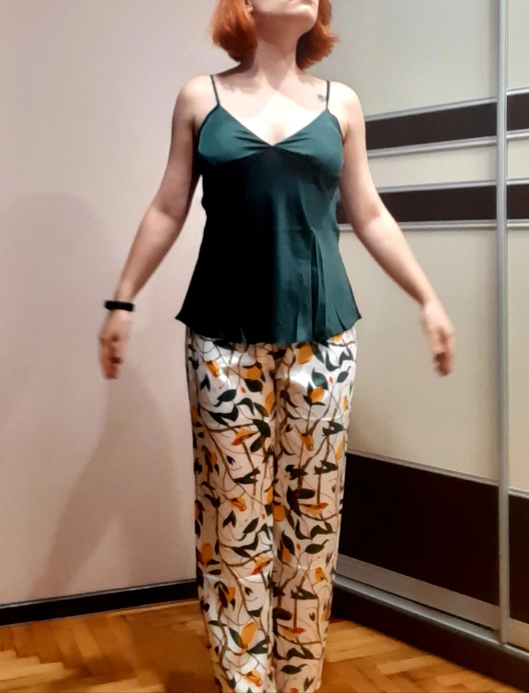 Заказ от 15.10 в г.Запорожье. При заказе отмечала доставку курьером, позже пришло смс, что посылка будет доставлена Новой почтой и необходимо выбрать отделение. 26.10 пришёл в указанное отделение Новой почты. Комплект приятный. Прошит хорошо, но кое-где торчат мелкие нитки. Ткань приятная к телу, хоть на взгляд такой не кажется. Шортики прилегают к ногам полностью, штаны - свободные. Топ и сорочка сели очень хорошо. На свои параметры (90-75-95, вес 60) взяла L, всё нравится. Сразу же закинула в стирку на деликатную 30° - комплект чувствует себя отлично.