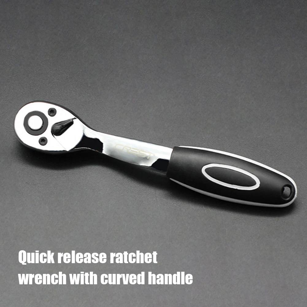 3. Быстро падающий Трещоточный ключ (положительный и отрицательный регулируемый), функция быстрого сброса кнопки может гарантировать, что розетка надежно заблокирована во время использования, И гнездо можно легко снять или быстро заменить жирными или жирными пальцами. Наше высокое качество 45-зуб храповика может увеличить скорость работы. Это идеальный набор инструментов для открытия ускорителя, кондиционеров, гаек для сидений, крышек шин, дверных замков и небольших гаек, которые обычно используются в домашних хозяйствах (в основном включены).