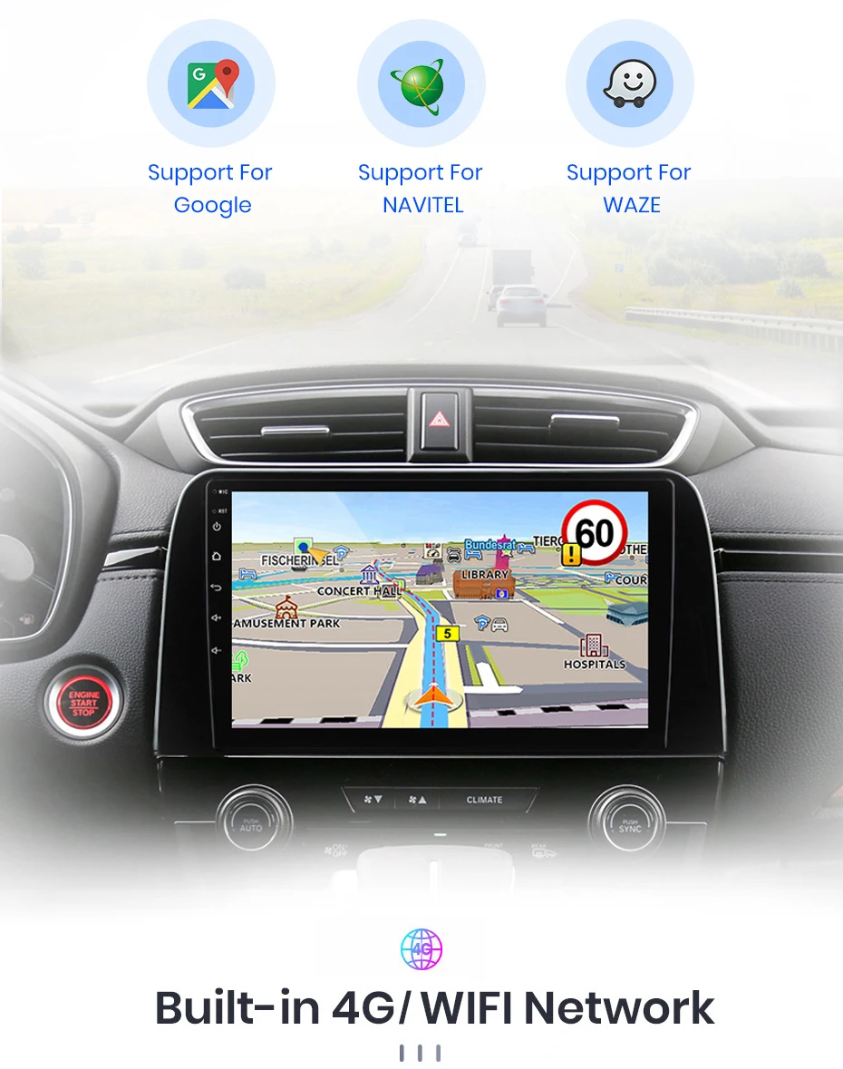 > Основные функции: Android 10,0 + 9 дюймов IPS Экран + 4 ядра 1,2 ГГц (восемь ядер 1,8 ГГц Dual Core опция) + флэш-память DDR3 1 Гб (2 ГБ/4 ГБ/6 ГБ/8 Гб опционально) + память 16 Гб (32 ГБ/64 Гб/128 Гб опционально) + WIFI (4G сеть опционально) + зеркальная связь + управление рулевым колесом + RDS/DSP (опционально)