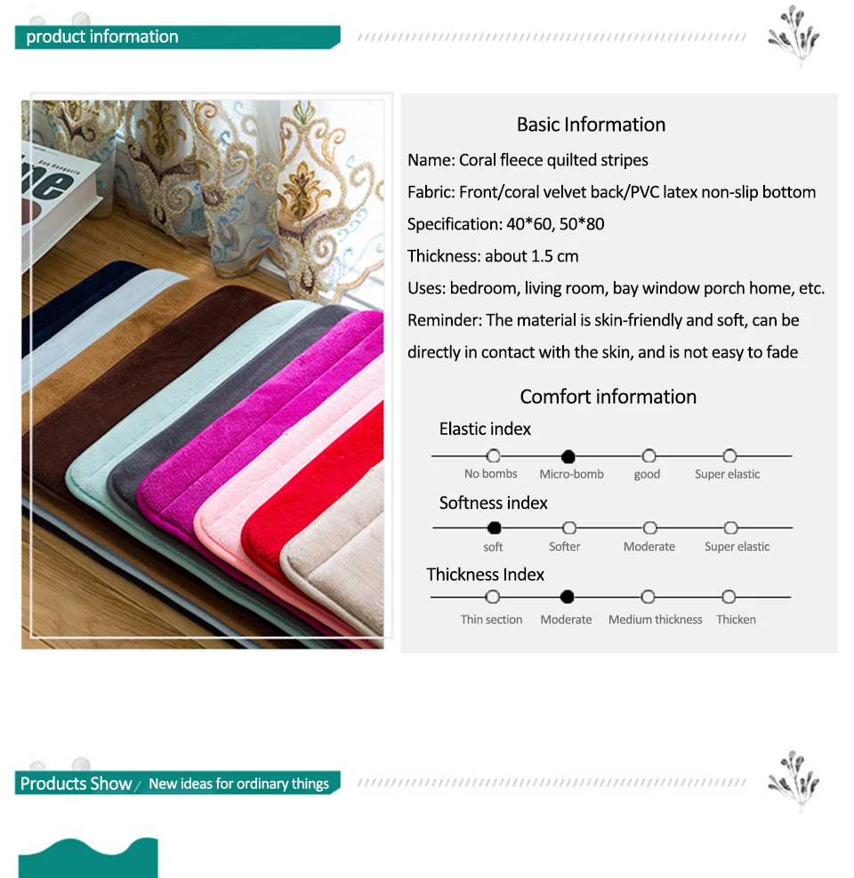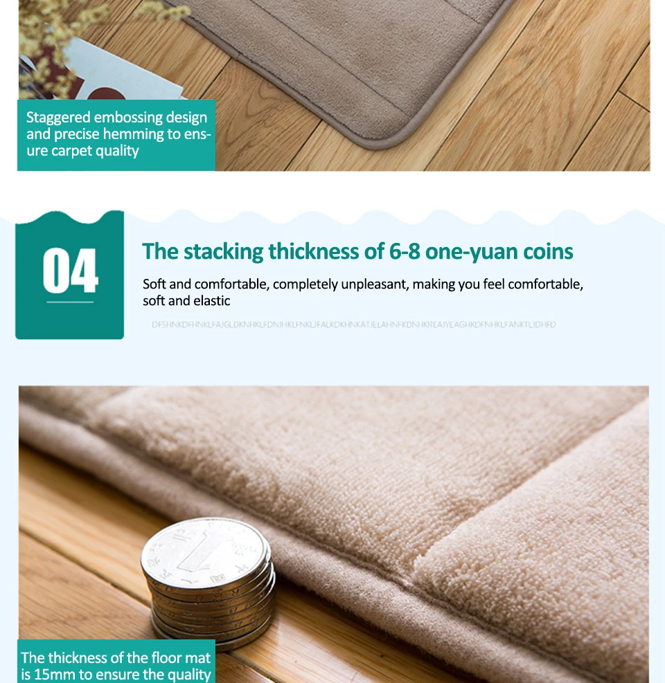 1. Поверхность изготовлена из кораллового флиса, мягкая и удобная, нескользящая латексная подошва, подкладка из пены с эффектом памяти, пена с эффектом памяти отличается от других ковриков для ванной, что более легко чистить и будет прессовывать форму своего индивидуального тела, поэтому она чувствует себя более удобной и мягкой.