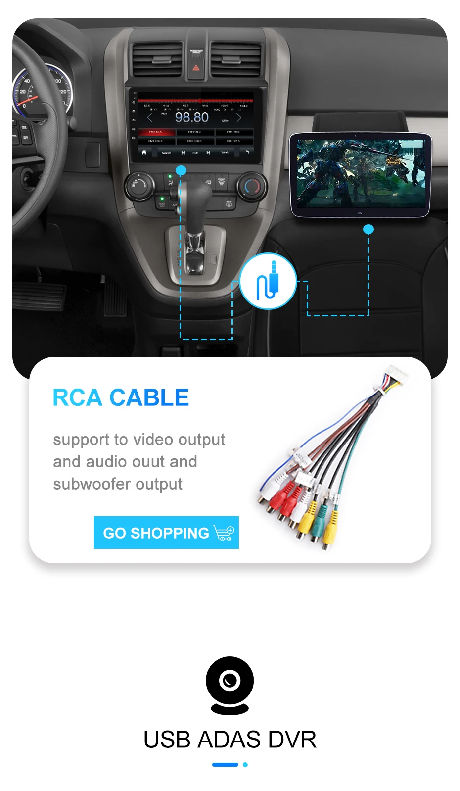 >>> Поддержка входа видео / AUXПоддержка видеовыхода, вы можете смотреть видео на внешнем монито ре, таком как монитор подголовника, потолочный монитор (кабель RCA н е входит в комплект, можно нажать, чтобы купить)