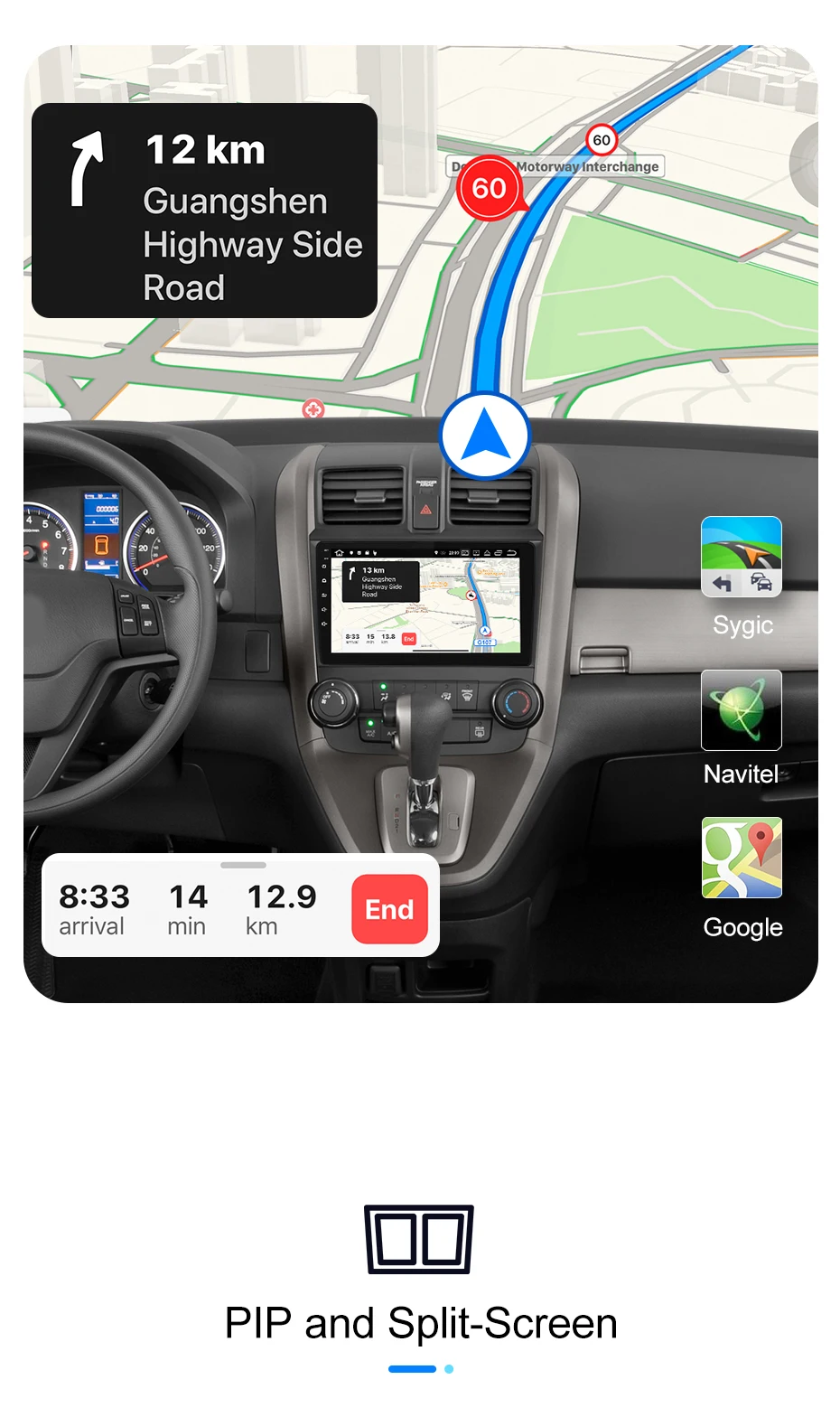 Картинка в картинке и разделенный экран>>> Видео всегда отображается во вложенных окнах, вы можете установ ить размер видеоинтерфейса по своему усмотрению.>>> Экран головного устройства может отображать два приложения одновременно. (не может одновременно отображать два аудио приложения)