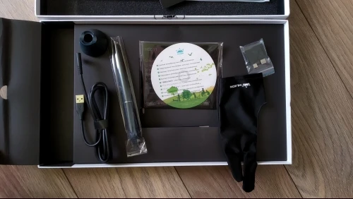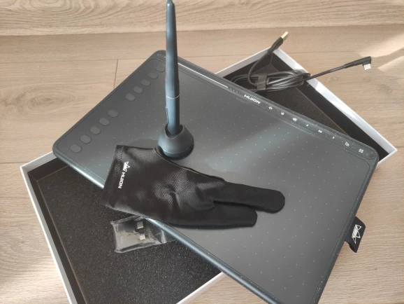 Товар соответствует описанию, в комплекте шло USB, два переходника для него, стилус, инструкция на 13-ти языках, перчатка, держатель для стилуса и 8 запасных наконечников в нëм. Коробка не повреждена. Планшет выполнен качественно и не скрипит, стилус хорошо скользит по поверхности. Это мой первый граф. планшет и я полностью доволен покупкой