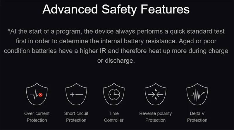 * В начале программы устройство всегда проводит Быстрый стандартный тест, чтобы определить внутреннее сопротивление батареи. Старение или плохое состояние батареи имеют более высокий ИК и поэтому нагреваются больше во время зарядки или разрядки.