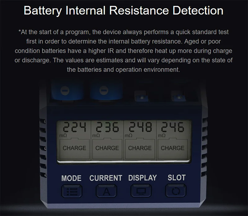 * В начале программы устройство всегда проводит Быстрый стандартный тест, чтобы определить внутреннее сопротивление батареи. Старение или плохое состояние батареи имеют более высокий ИК и поэтому нагреваются больше во время зарядки или разрядки. Значения являются оценочными и будут варьироваться в зависимости от состояния батарей и рабочей среды.
