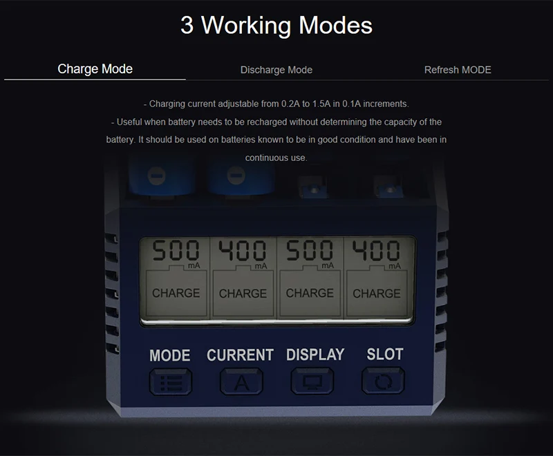 Четыре независимых слота, можно заряжать 1-4 шт NiMH AA или AAA в любых комбинациях