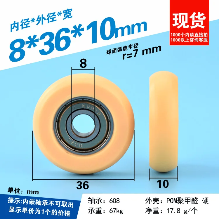 Параметры: 【Bearings】: 608 【Размер 】: ID = 8 мм, OD = 36 мм, ширина = 10 мм 【Радиус паза: r = 7 мм 【Материал 】: помпон, жесткий 【 Нагрузка: 67 кг 【Вес нетто 】: 17,8 г/шт. 【Упаковка: 1 комплект = 5 шт. Особенности: A.Встроенный точный микро-подшипник;
